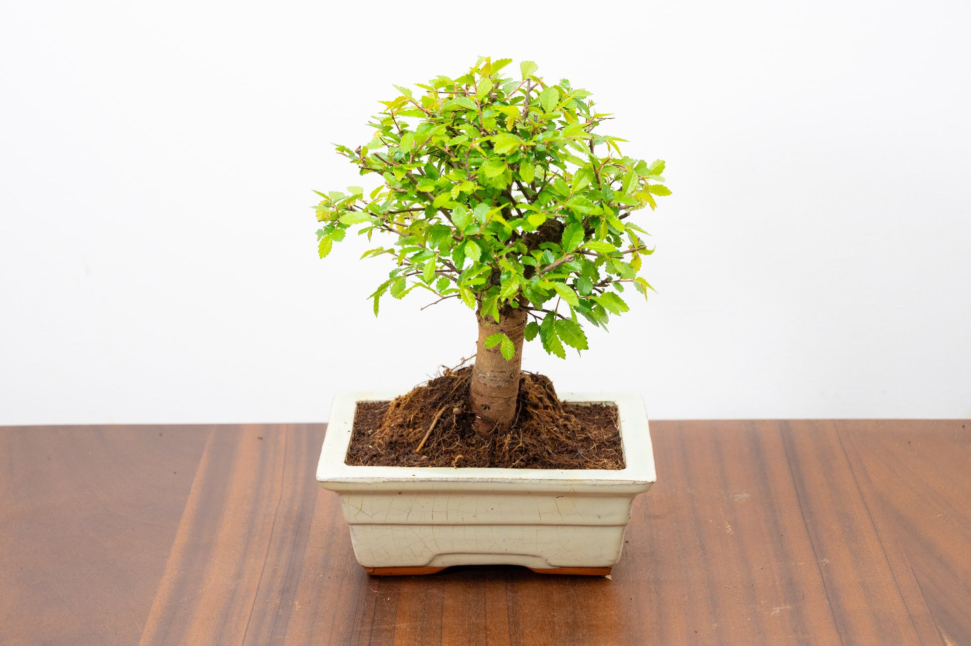 Chinese Elm - Zelkova bonsai tree, scissor/wire offer. Semi evergreen Broom style Bonsai Planted in a Cream ceramic pot.