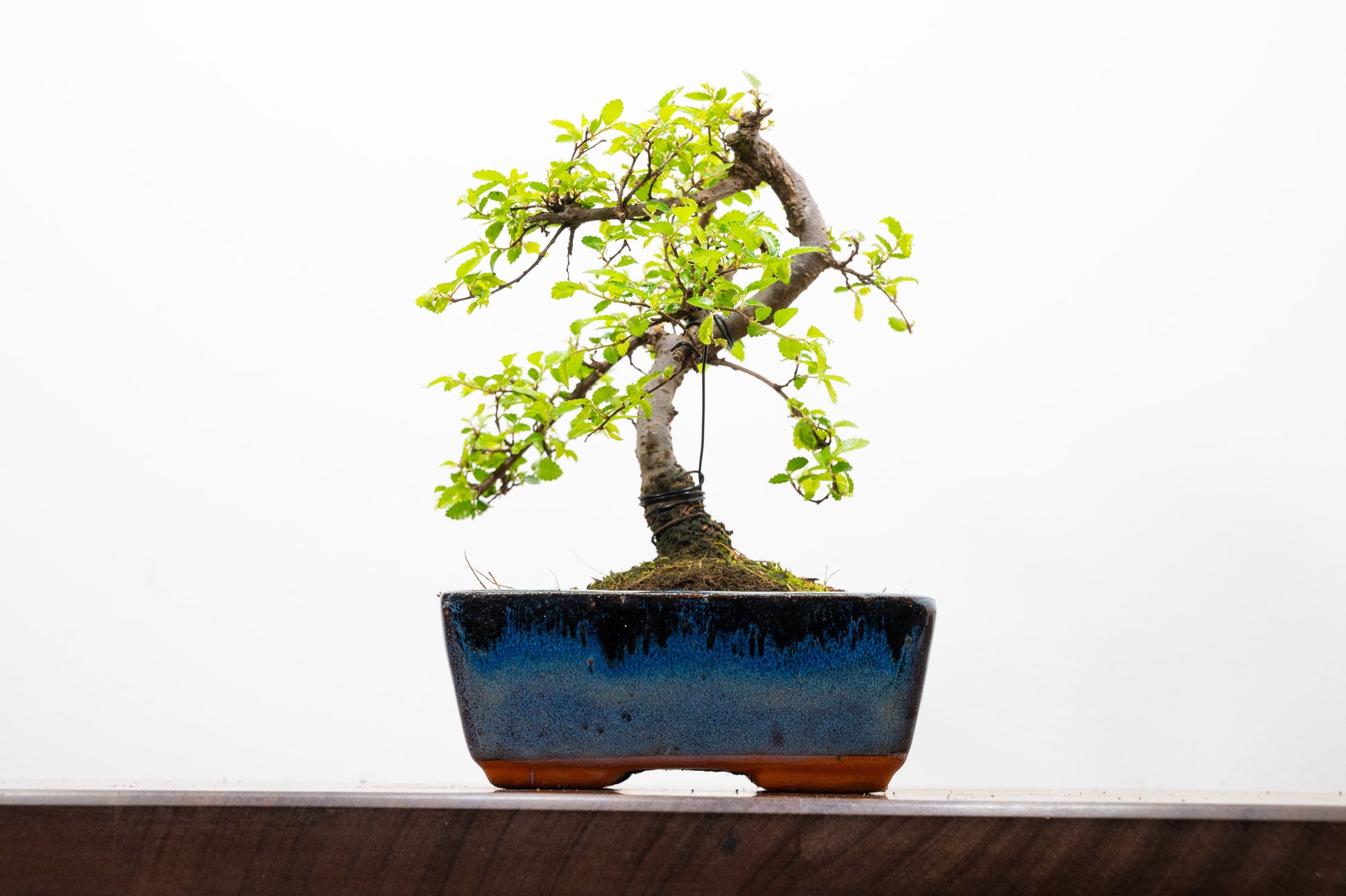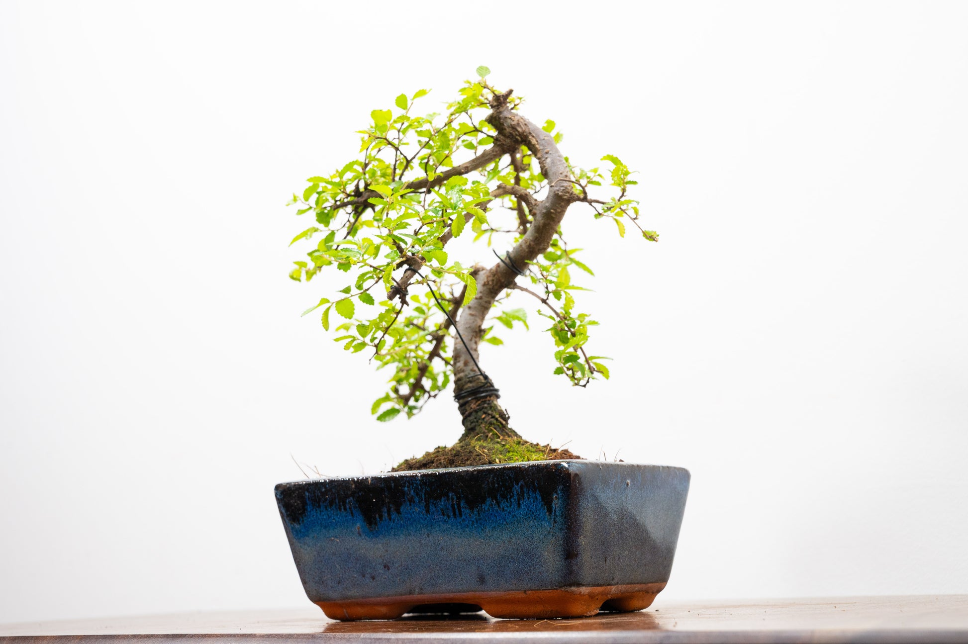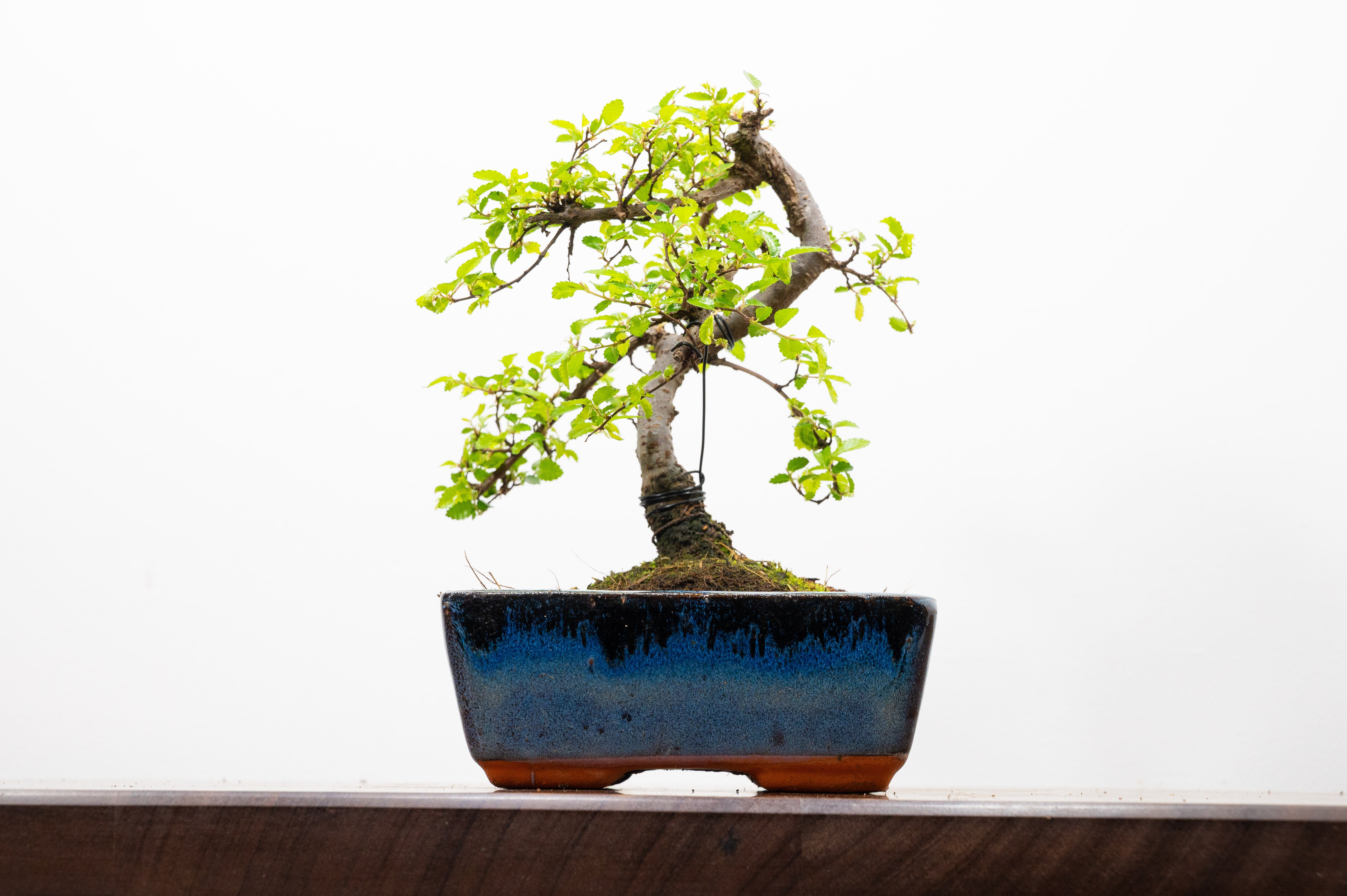 Chinese Elm - Zelkova bonsai tree, scissor/wire offer. Semi evergreen bonsai. Planted in a blue ceramic pot.
