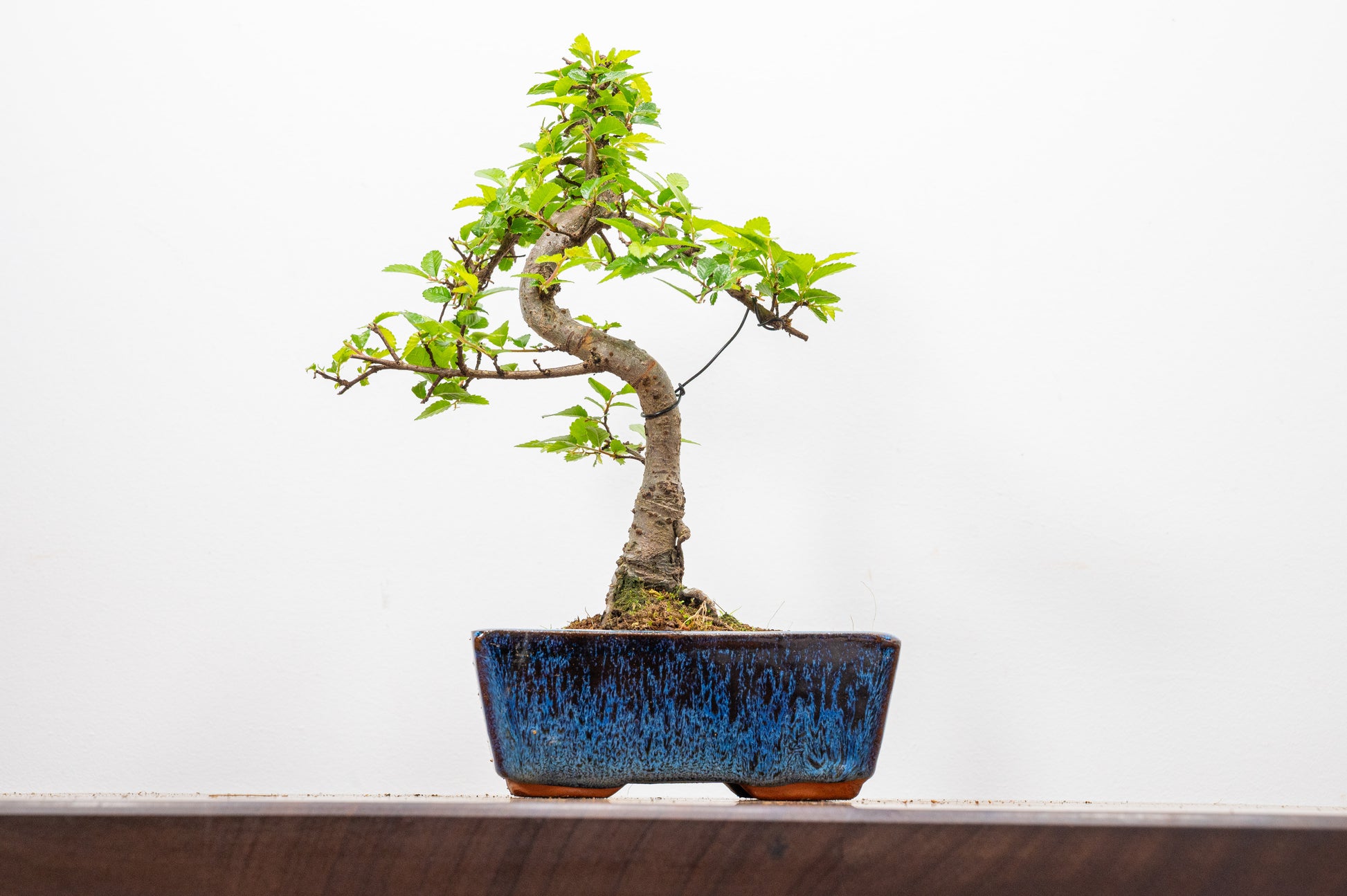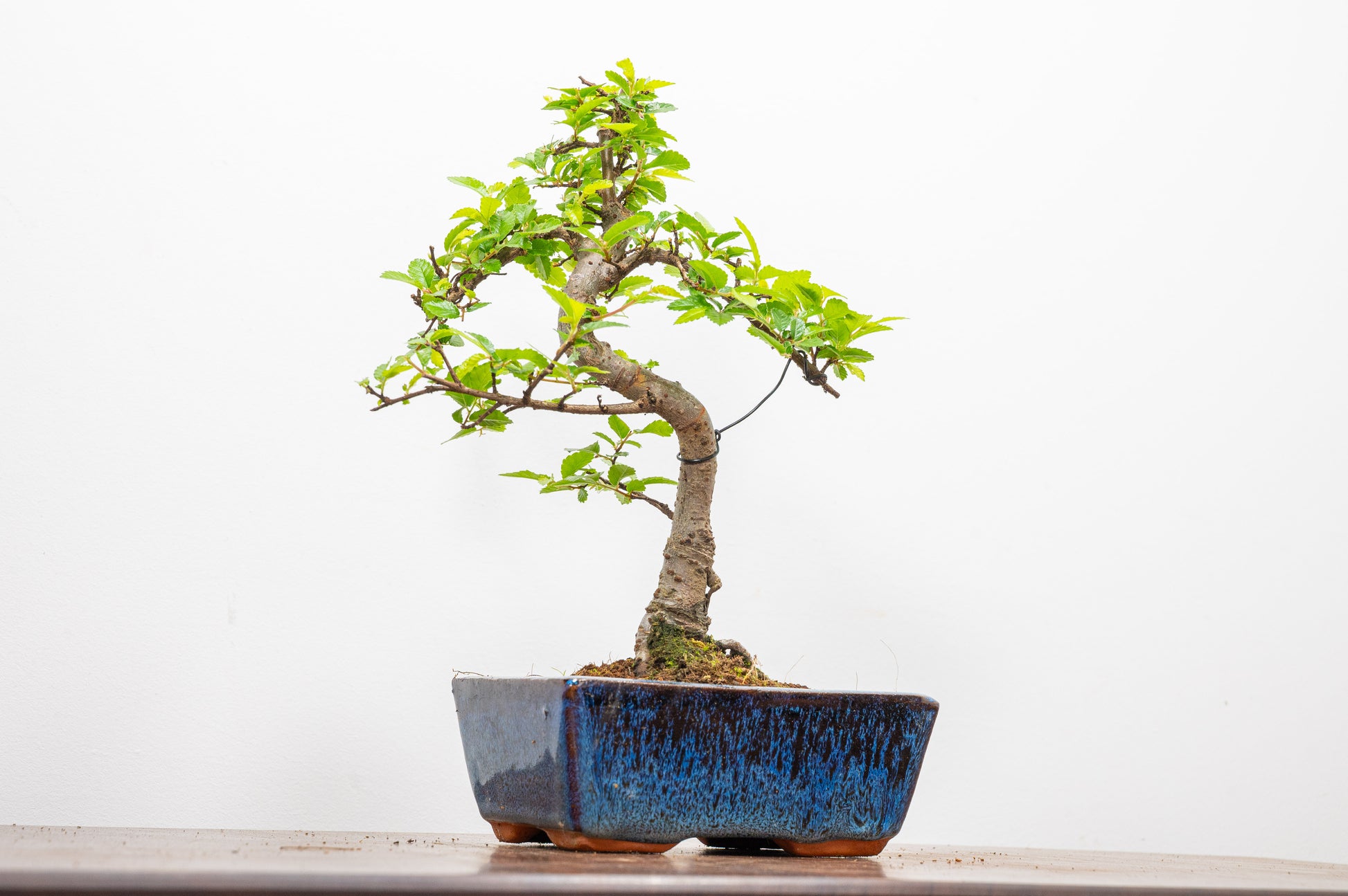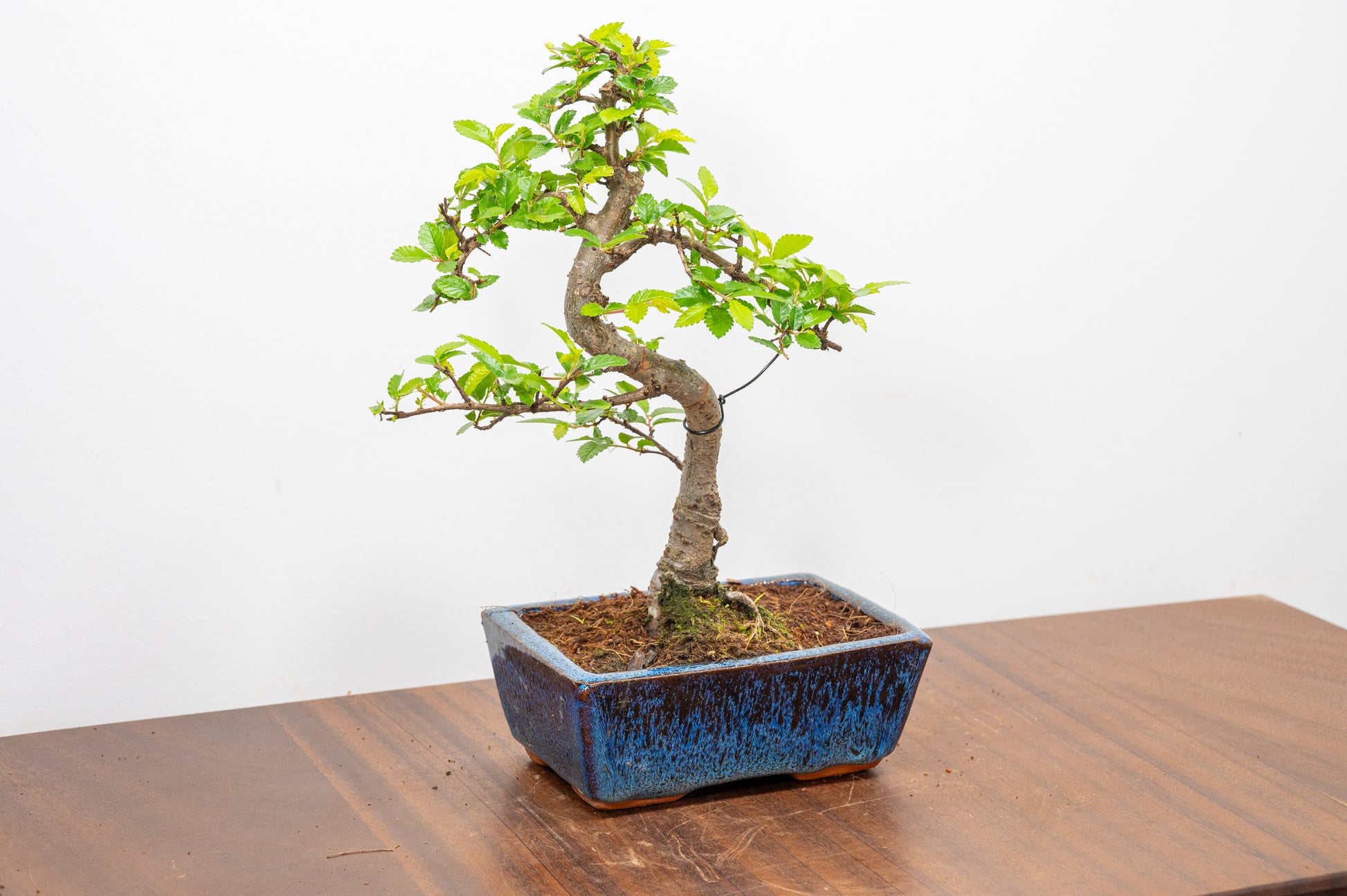 Chinese Elm - Zelkova bonsai tree, scissor/wire offer. Semi evergreen bonsai. Planted in a blue ceramic pot.