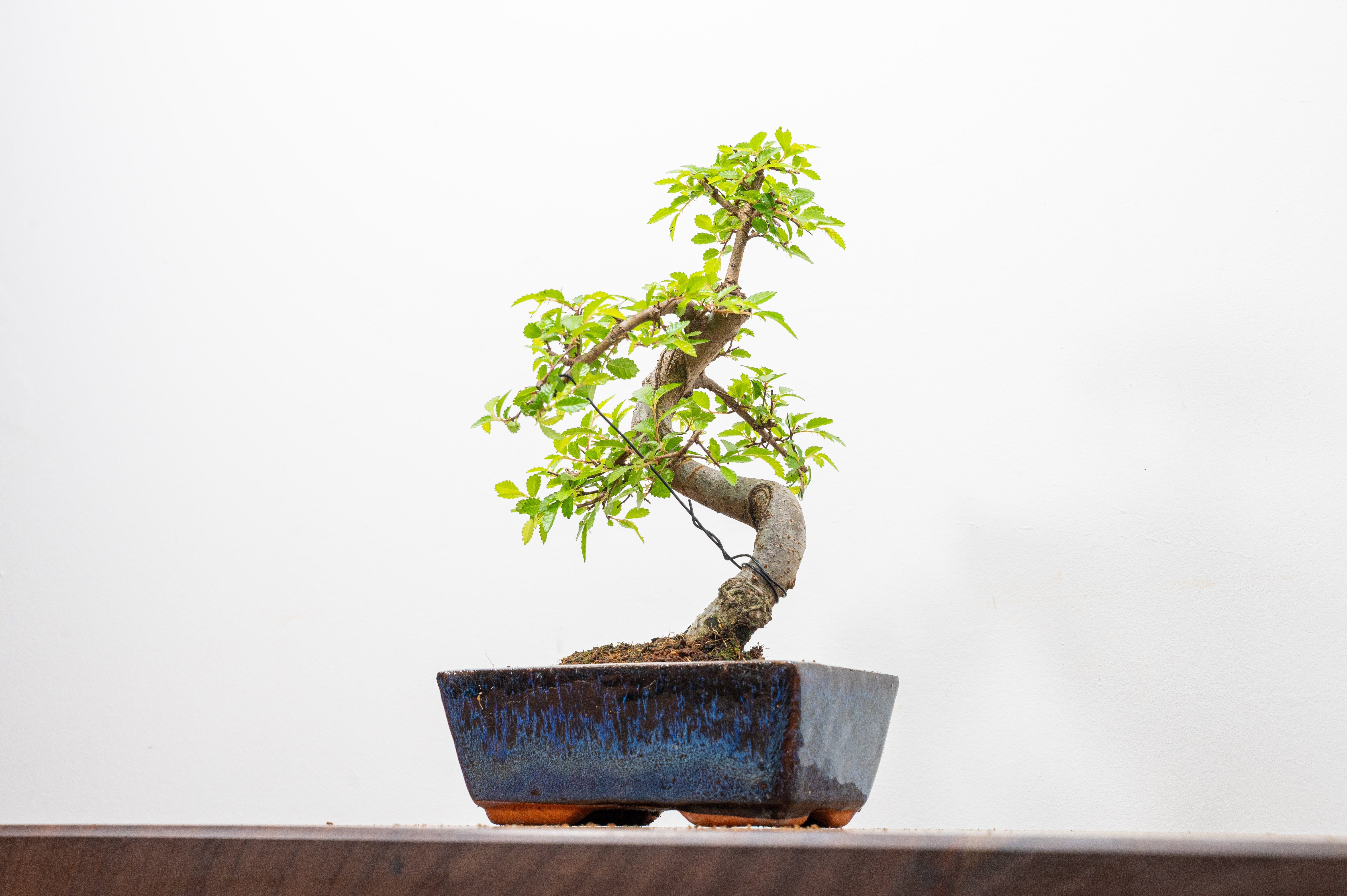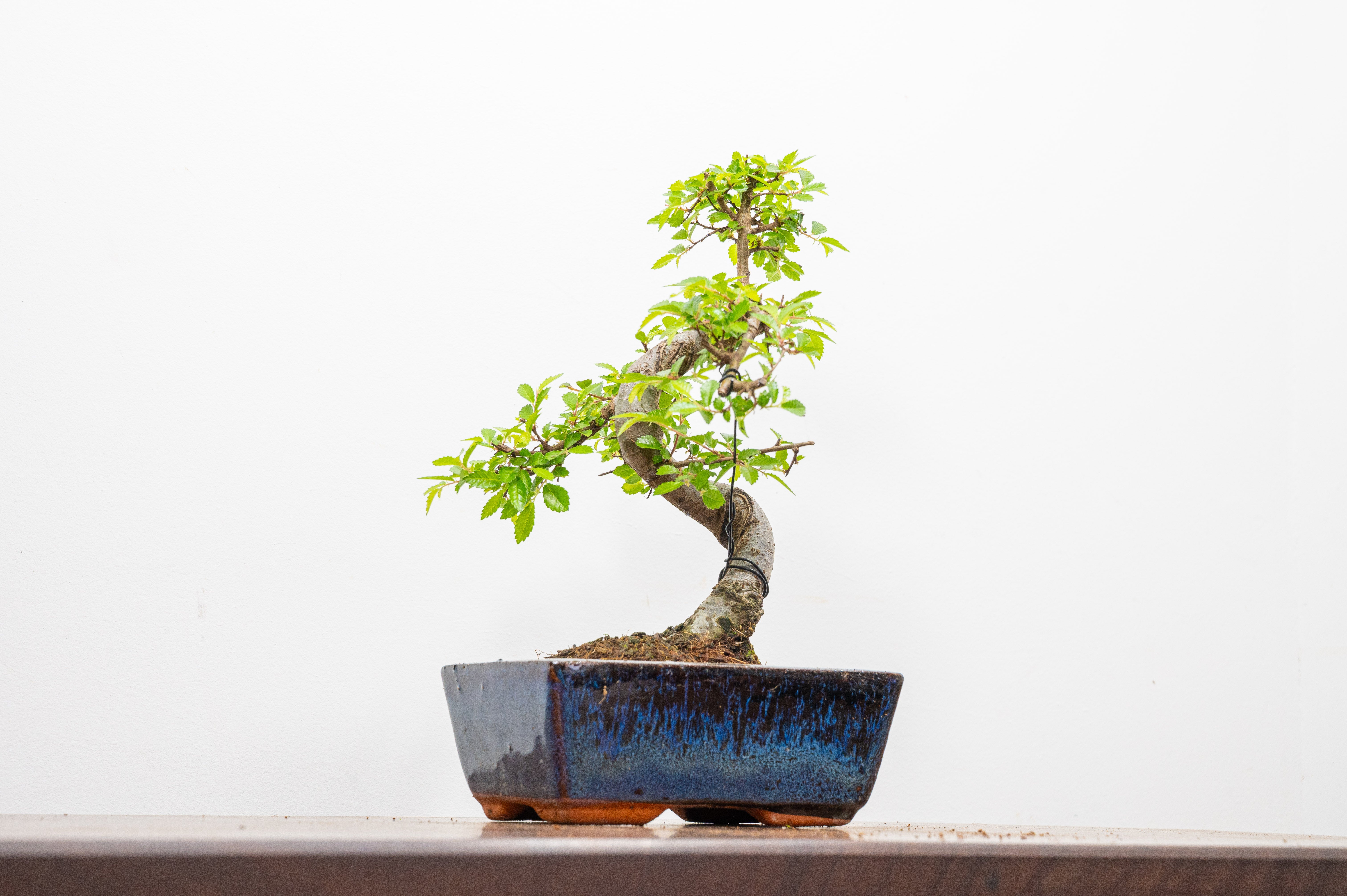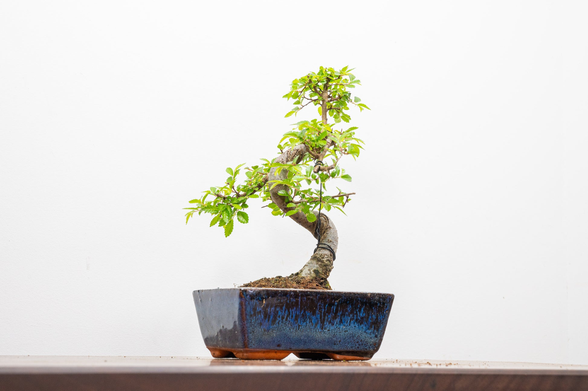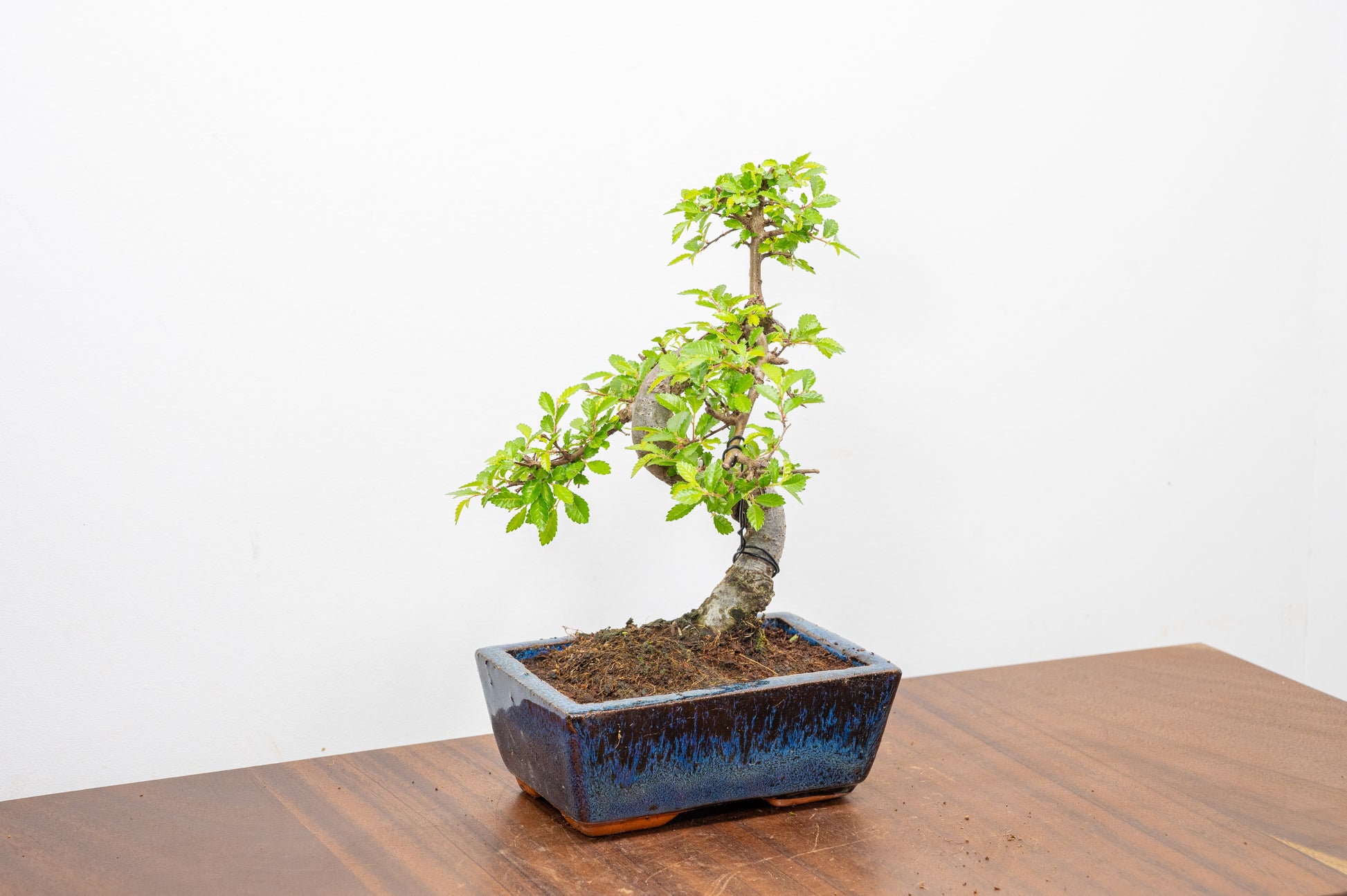 Chinese Elm - Zelkova bonsai tree, scissor/wire offer. Semi evergreen bonsai. Planted in a blue ceramic pot.