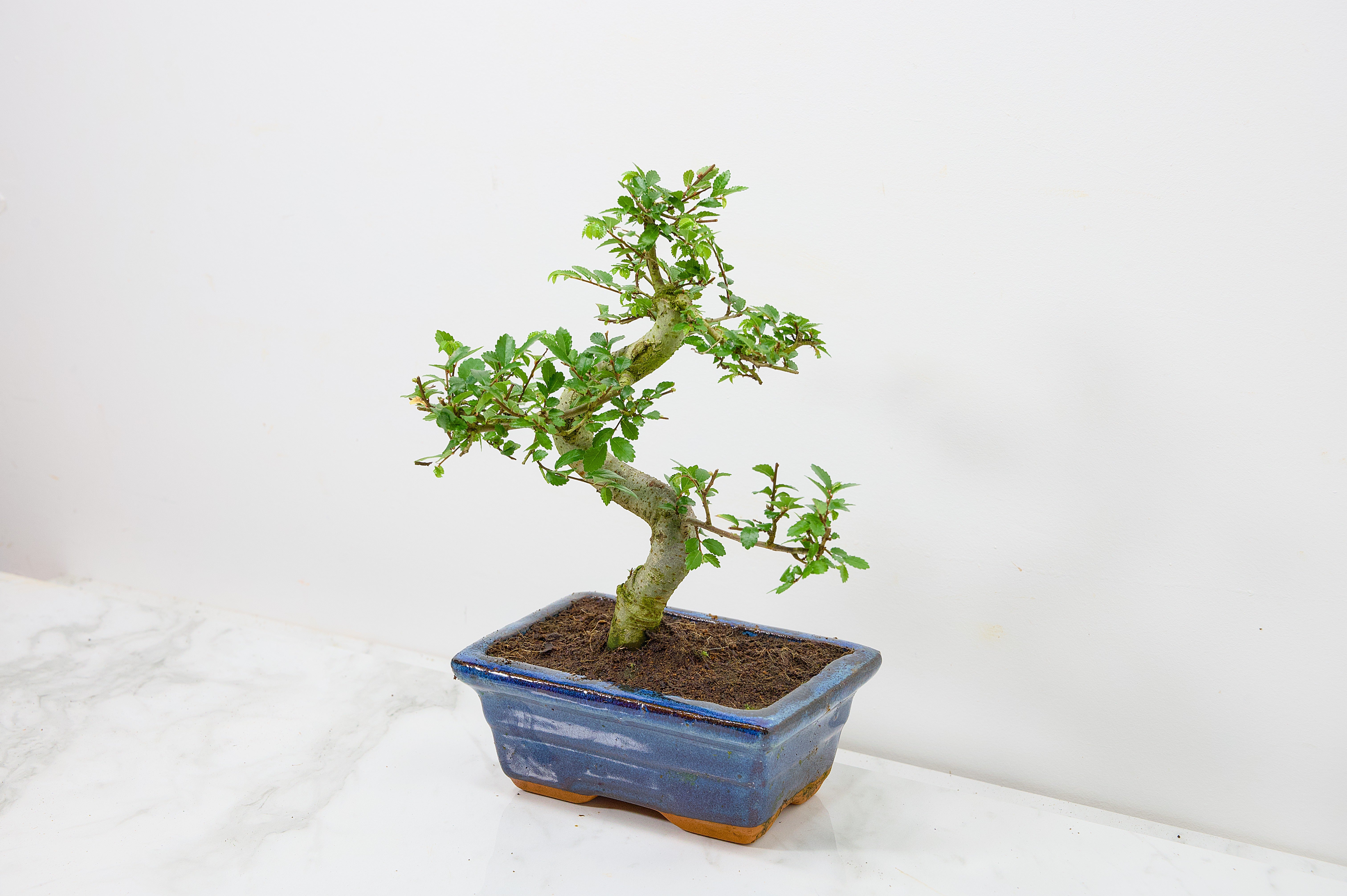 Chinese Elm - Zelkova bonsai tree, scissor/wire offer. Semi evergreen bonsai. Planted in a blue ceramic pot.