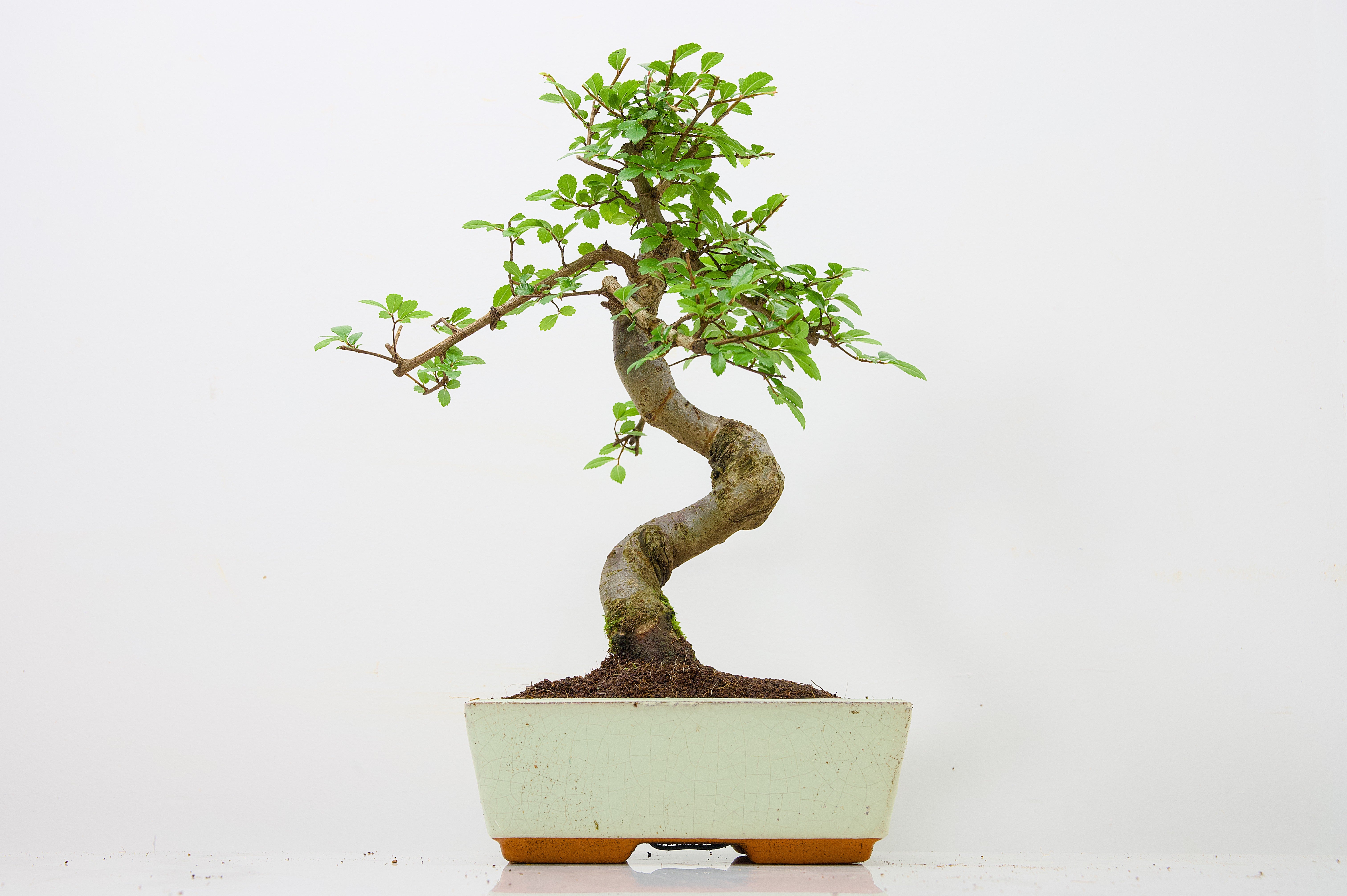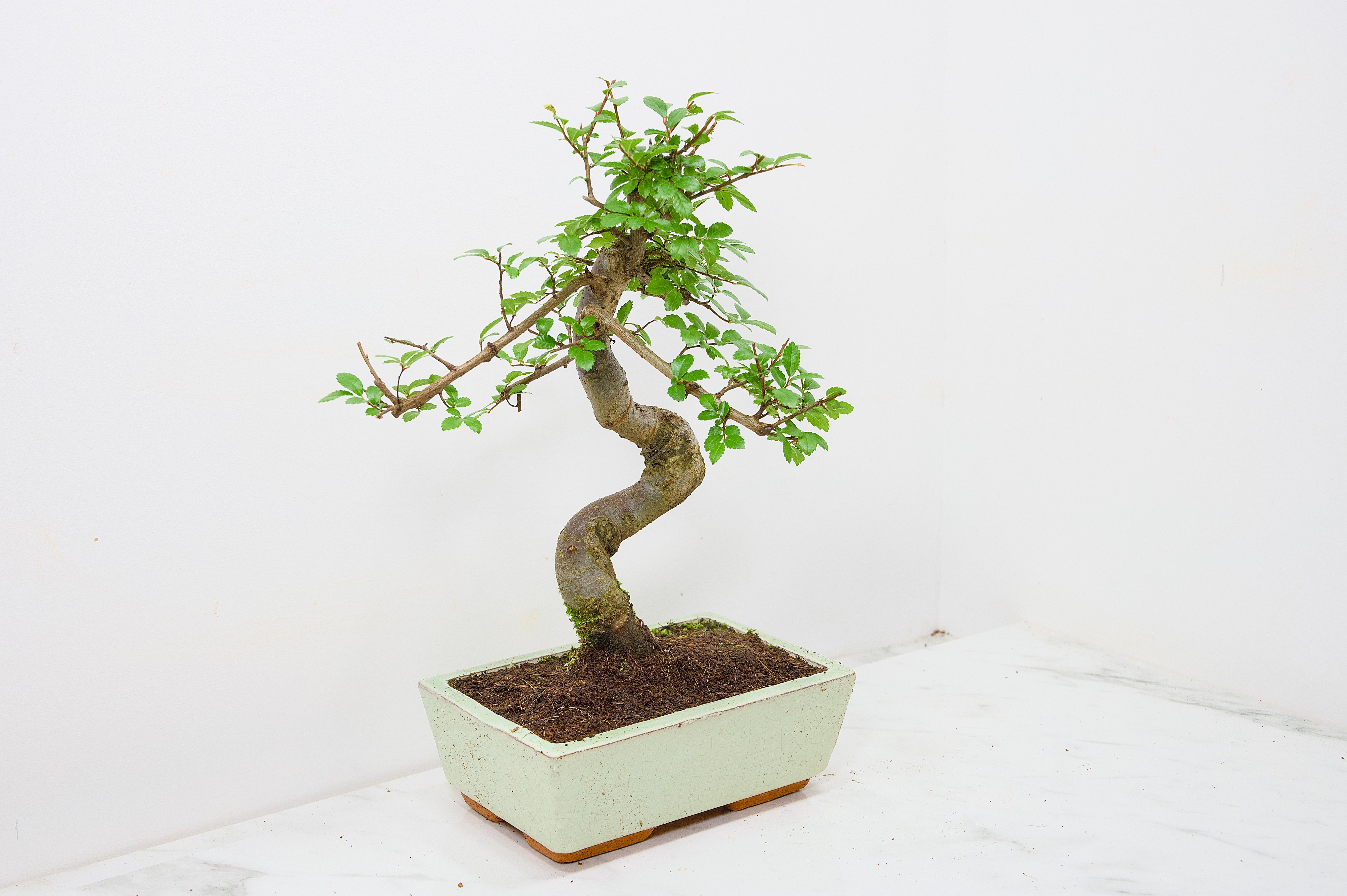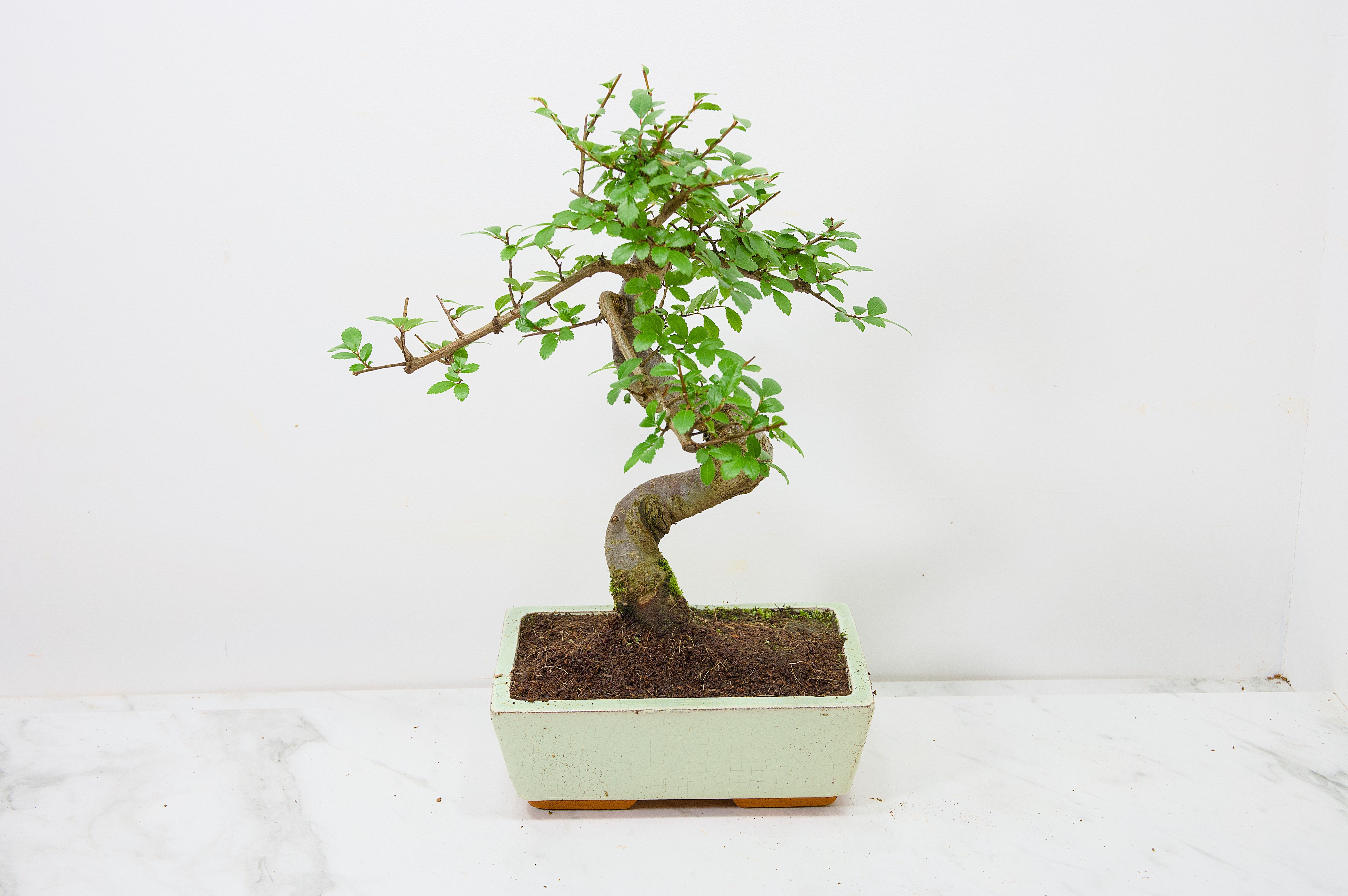 Chinese Elm - Zelkova bonsai tree, scissor/wire offer. Semi evergreen bonsai. Planted in a Cream ceramic pot.