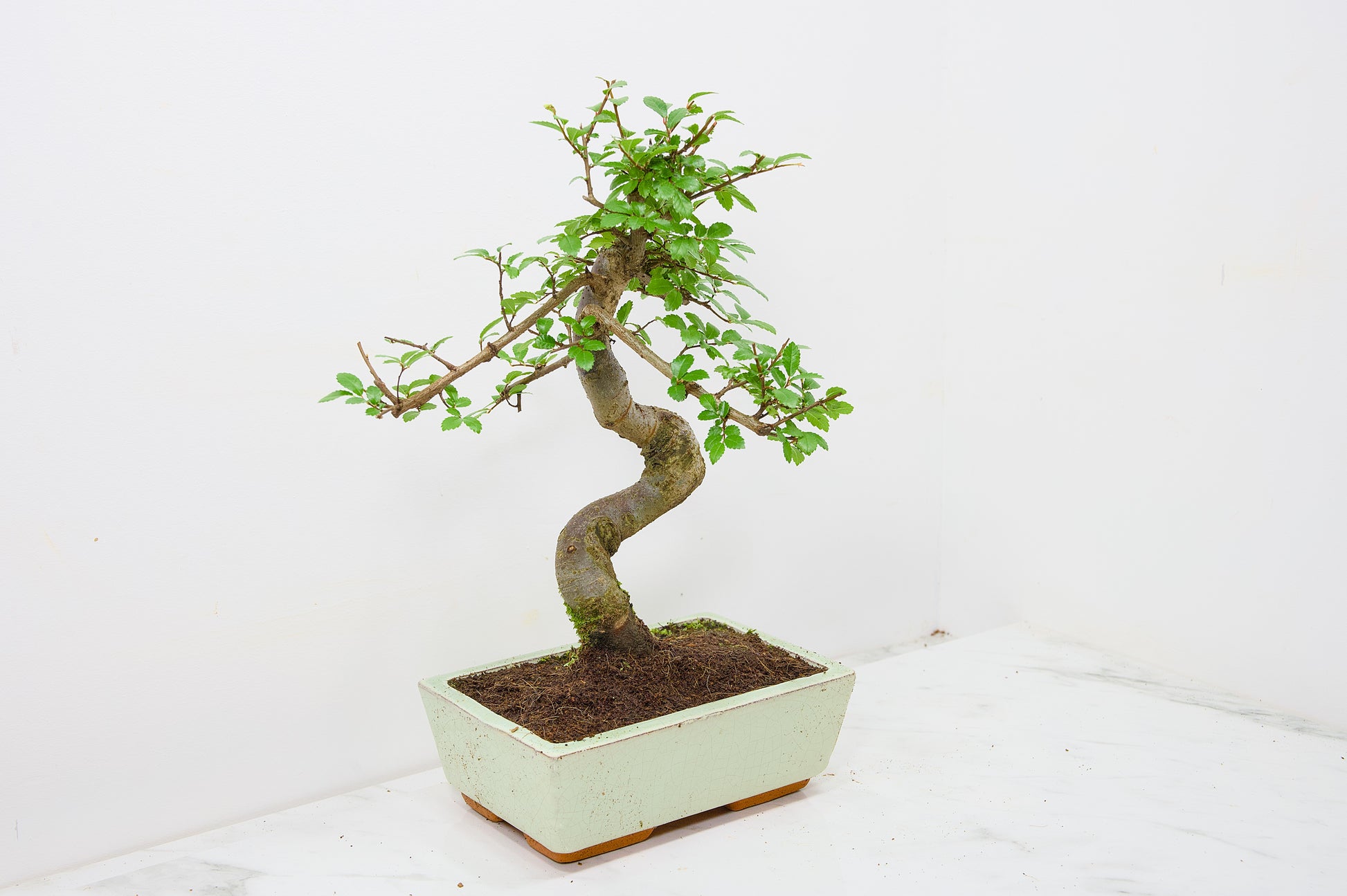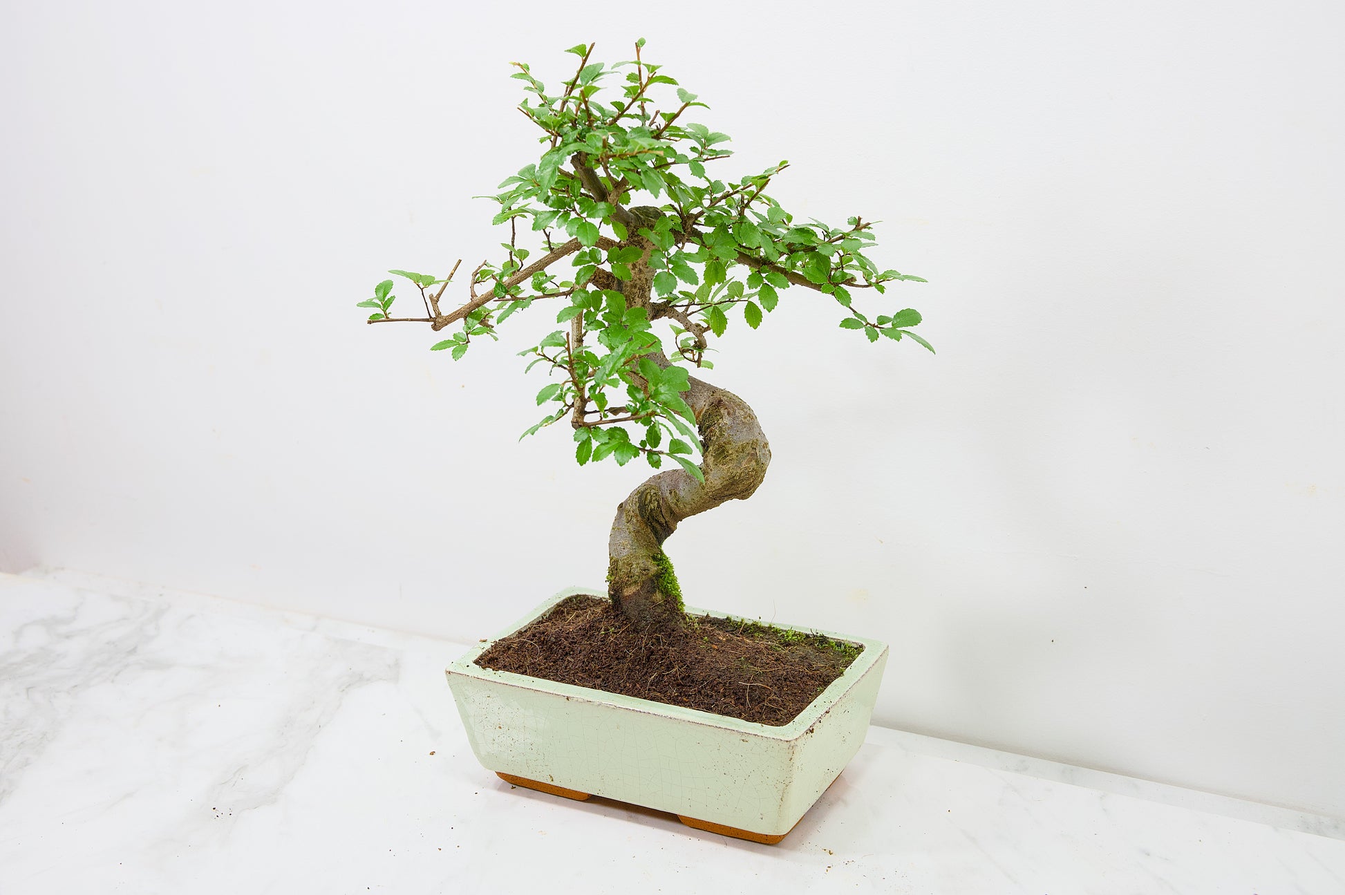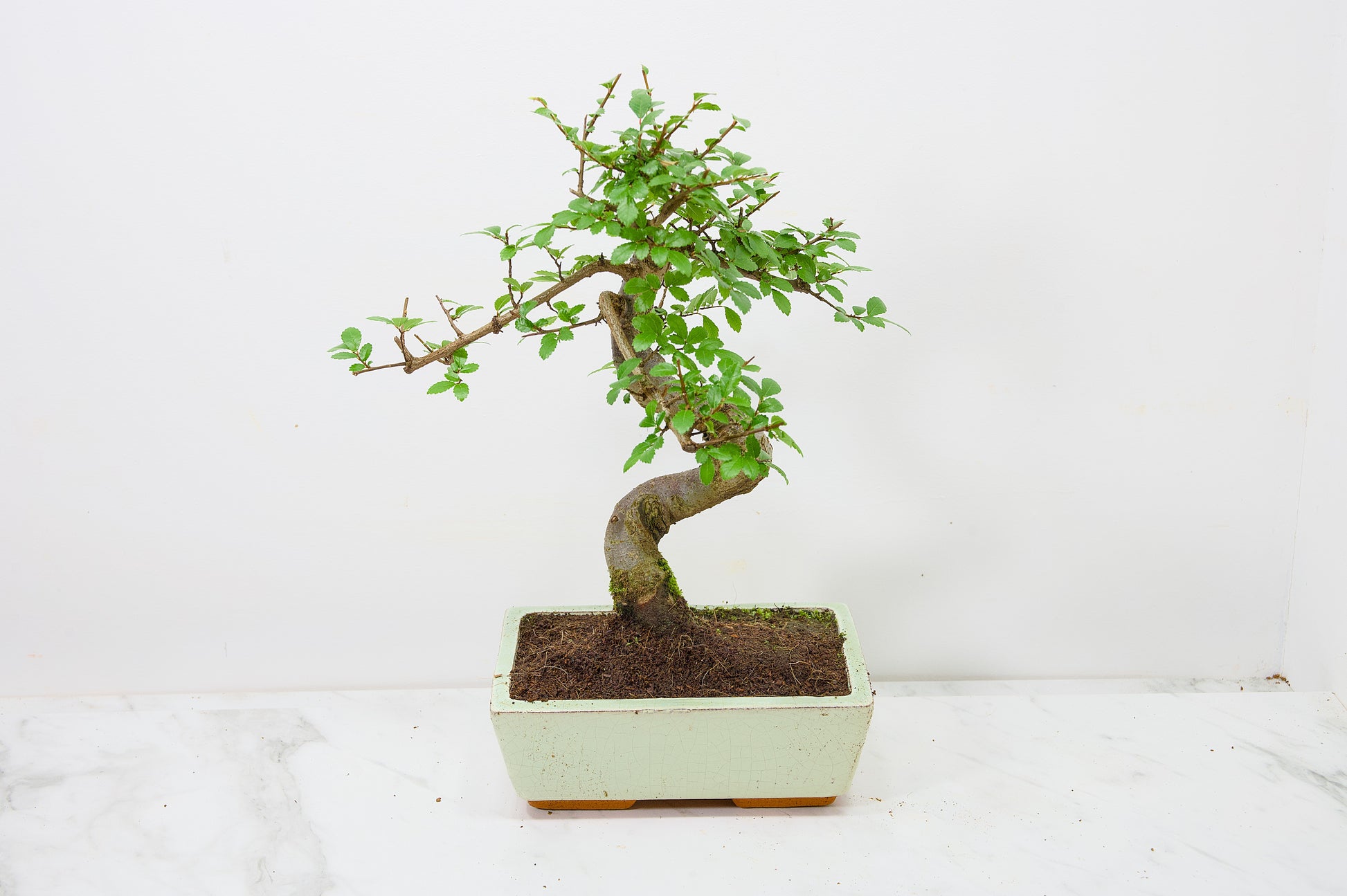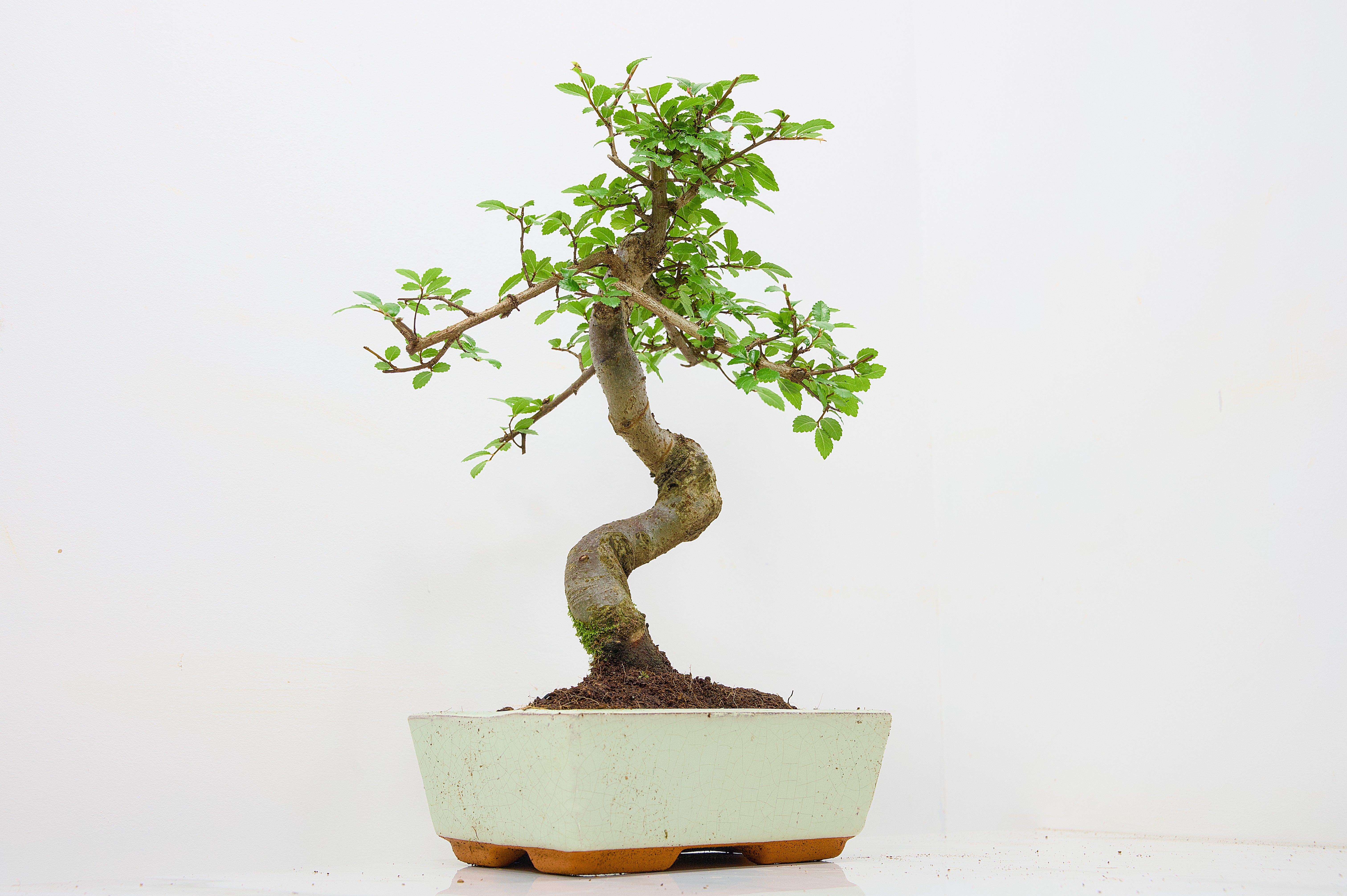 Chinese Elm - Zelkova bonsai tree, scissor/wire offer. Semi evergreen bonsai. Planted in a Cream ceramic pot.