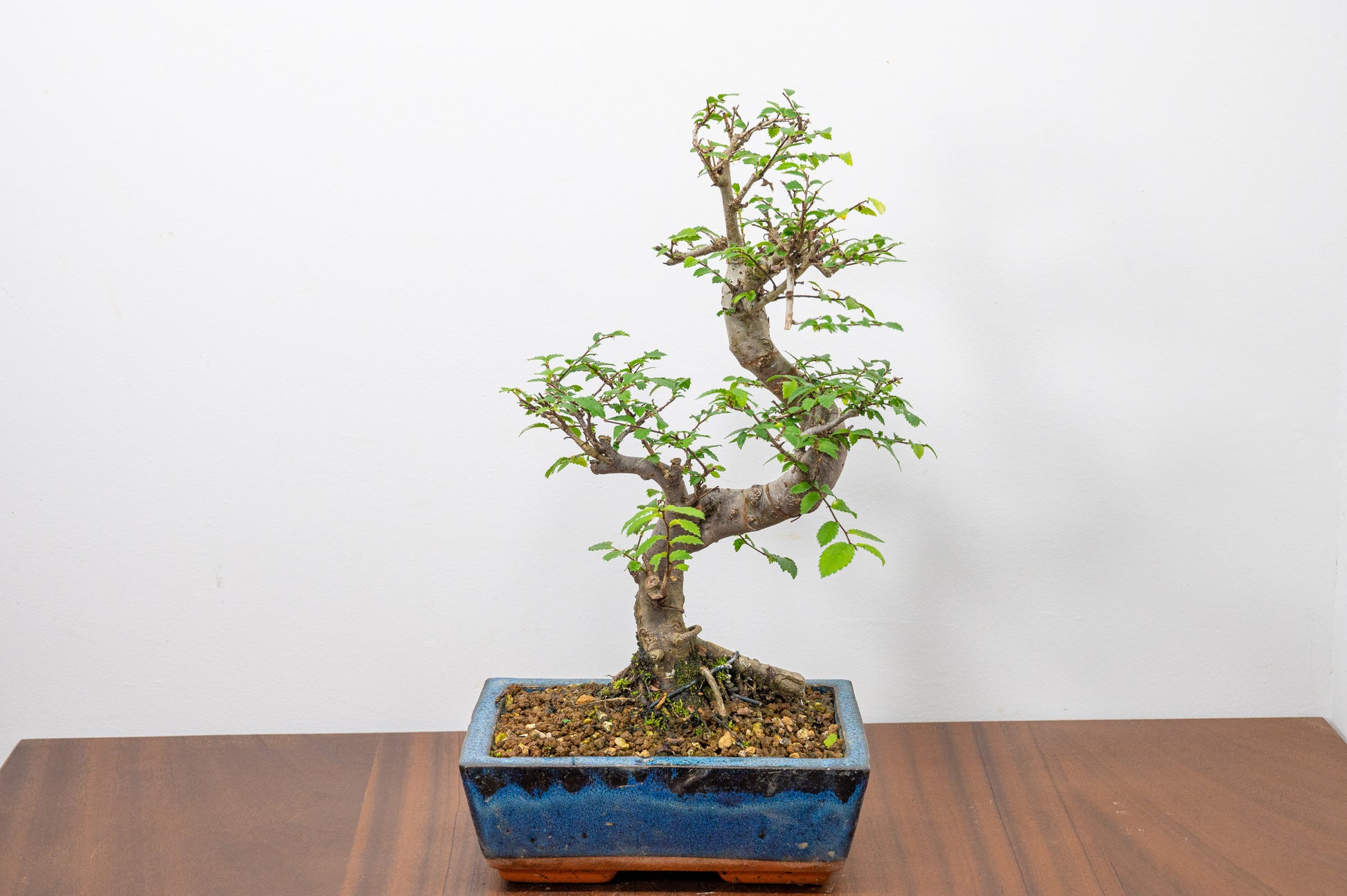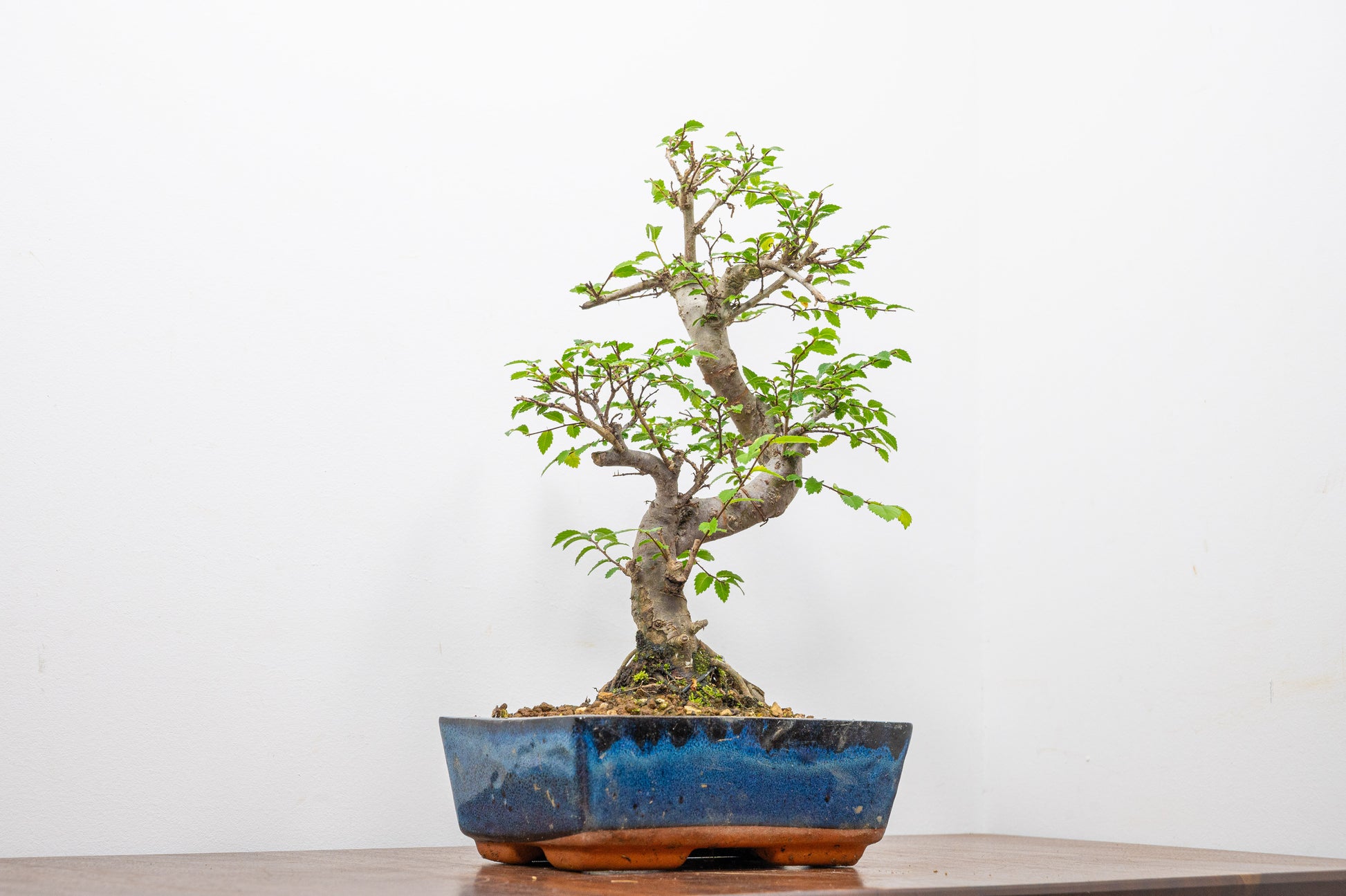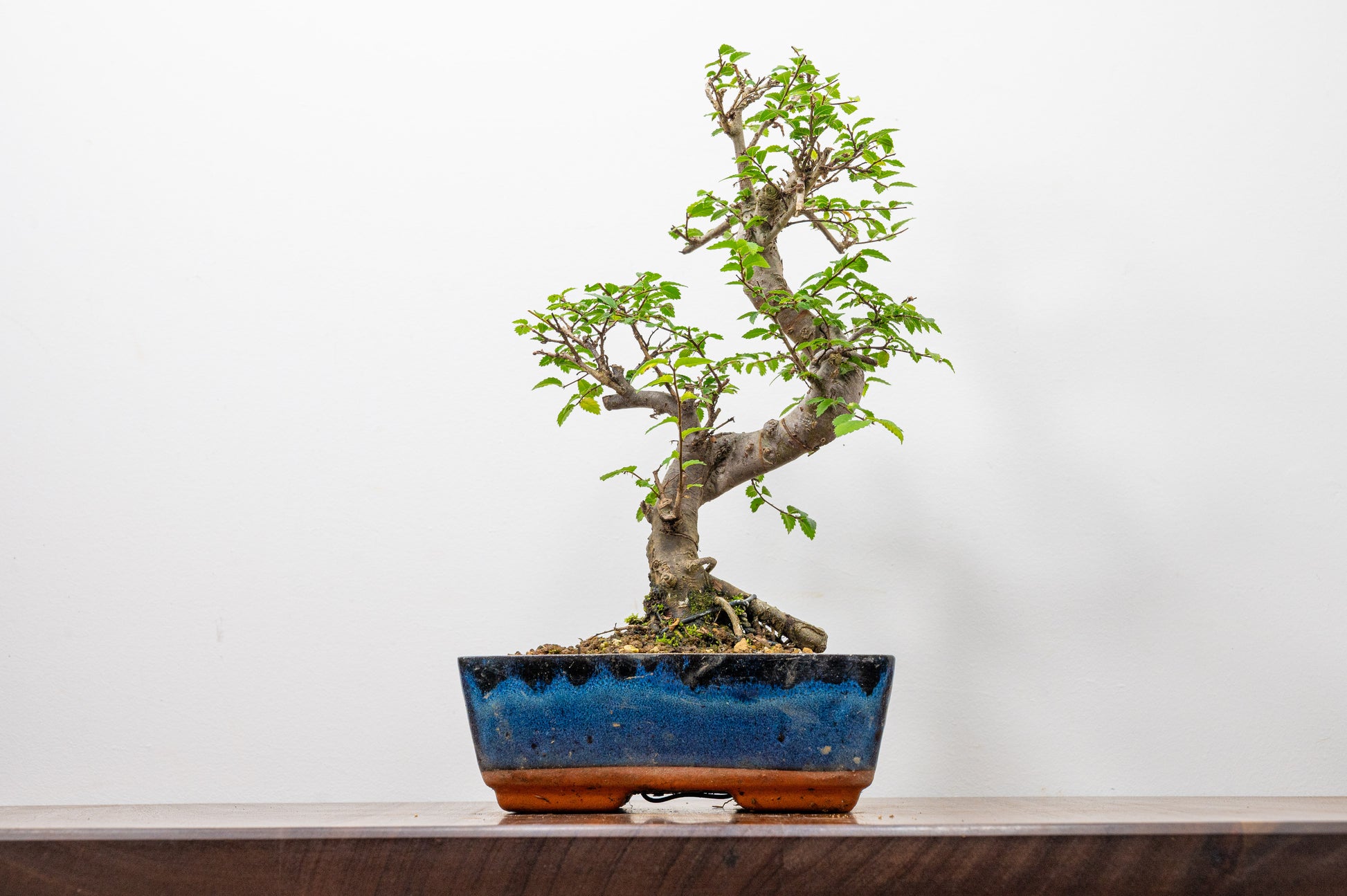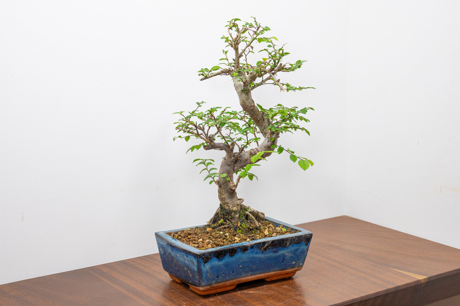 Chinese Elm - Zelkova bonsai tree, scissor/wire offer. Semi evergreen bonsai. Planted in a blue ceramic pot.