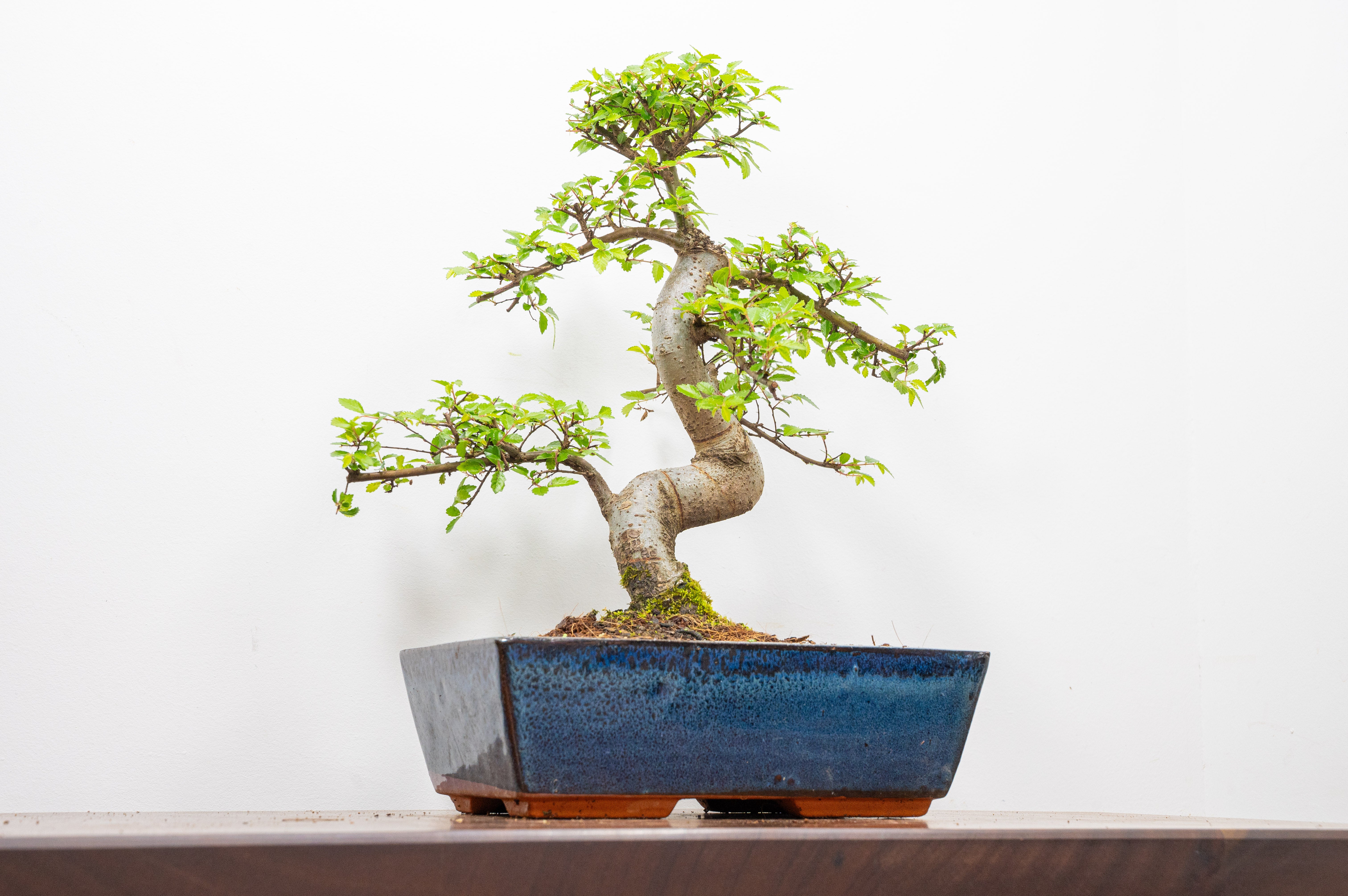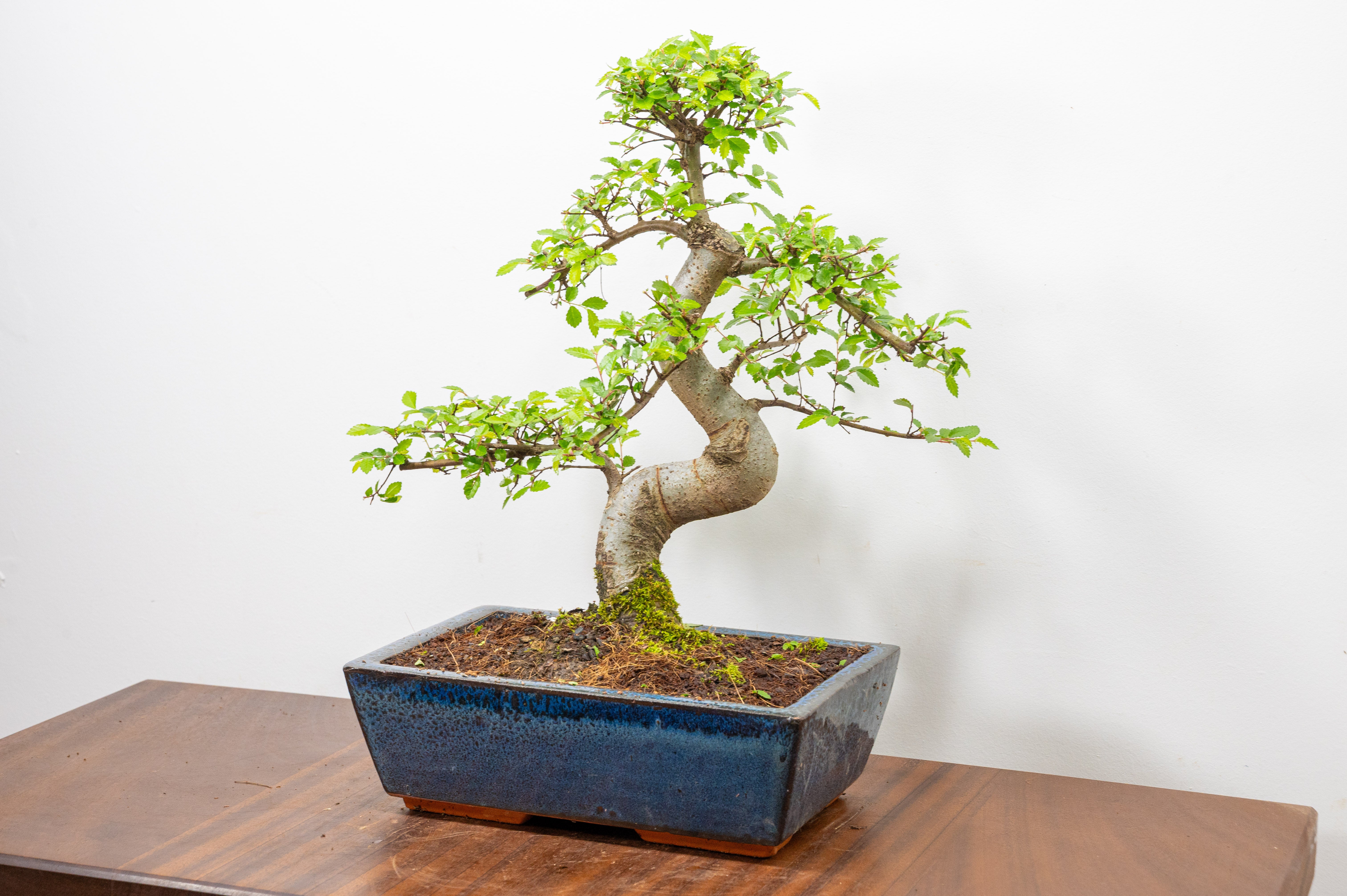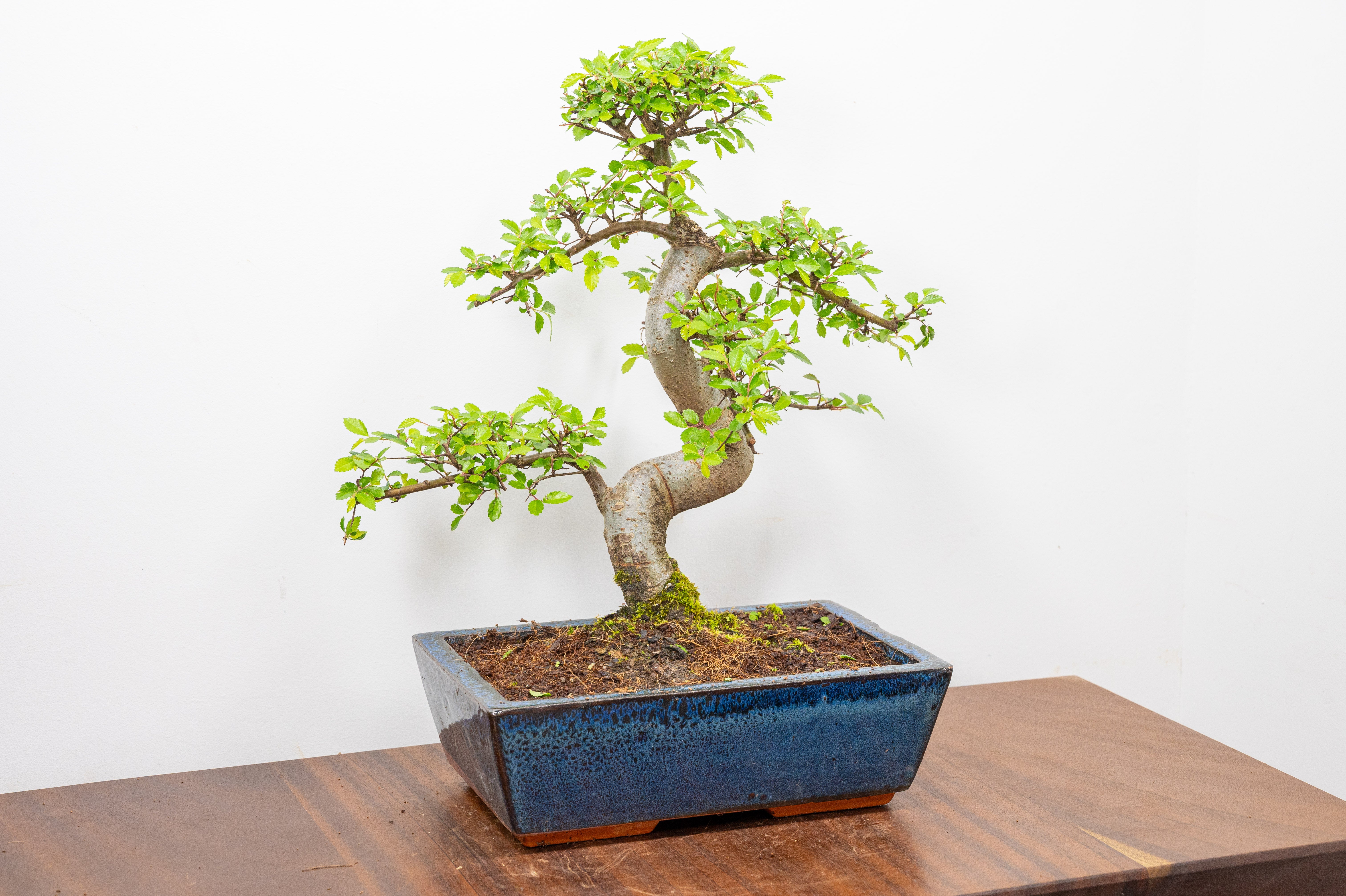 Chinese Elm - Zelkova bonsai tree, scissor/wire offer. Semi evergreen bonsai. Planted in a blue ceramic imported pot.