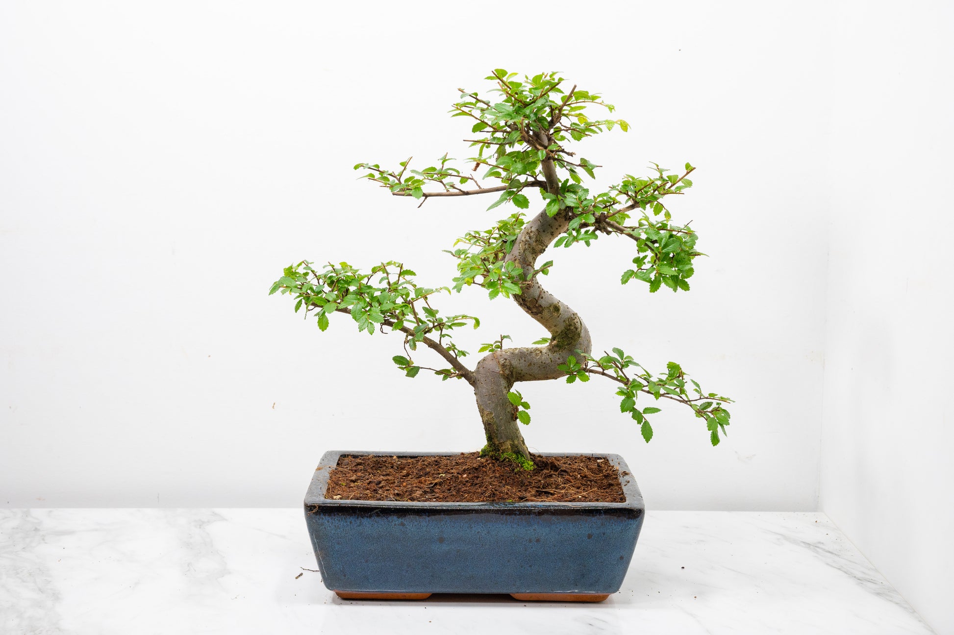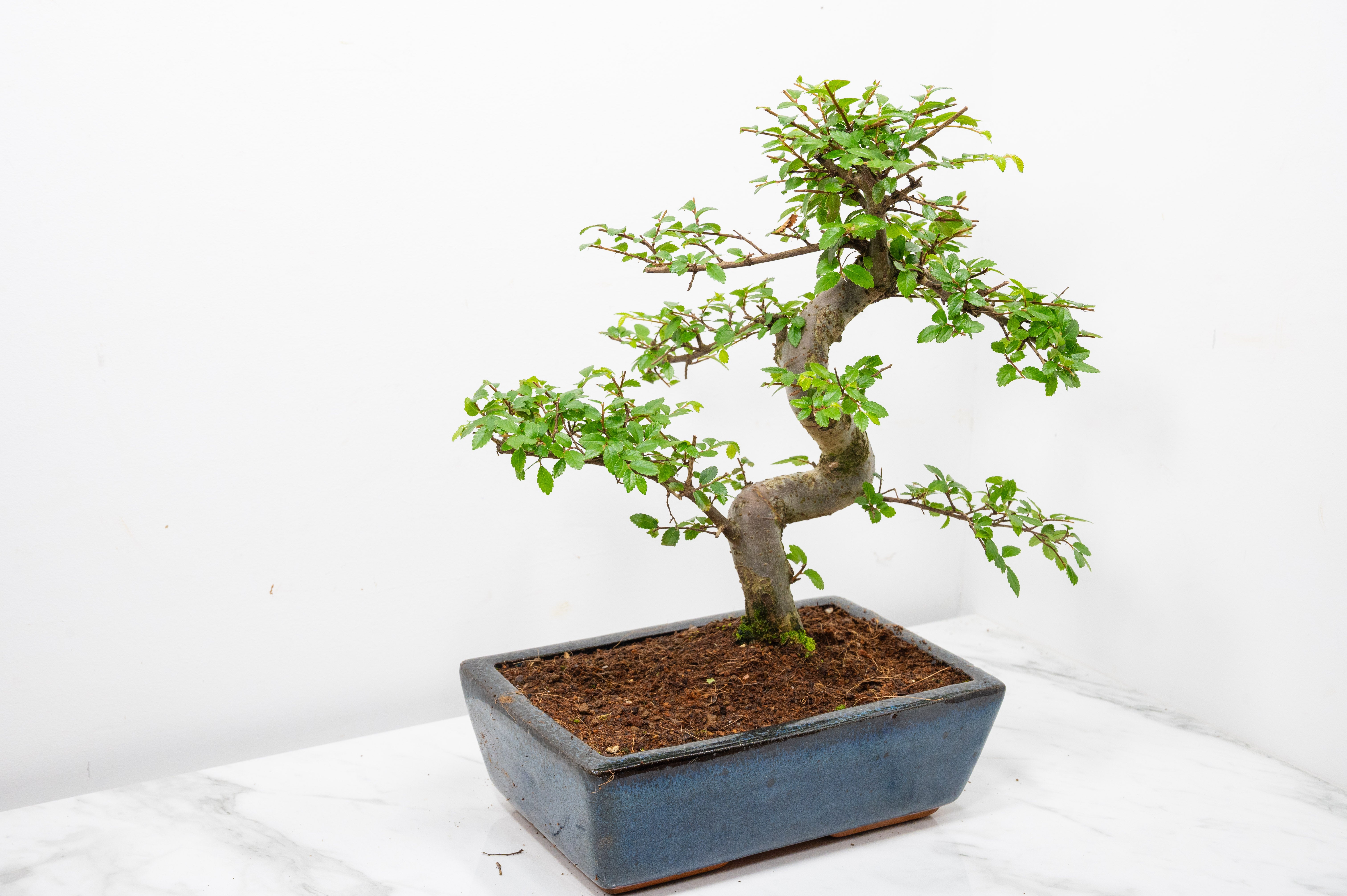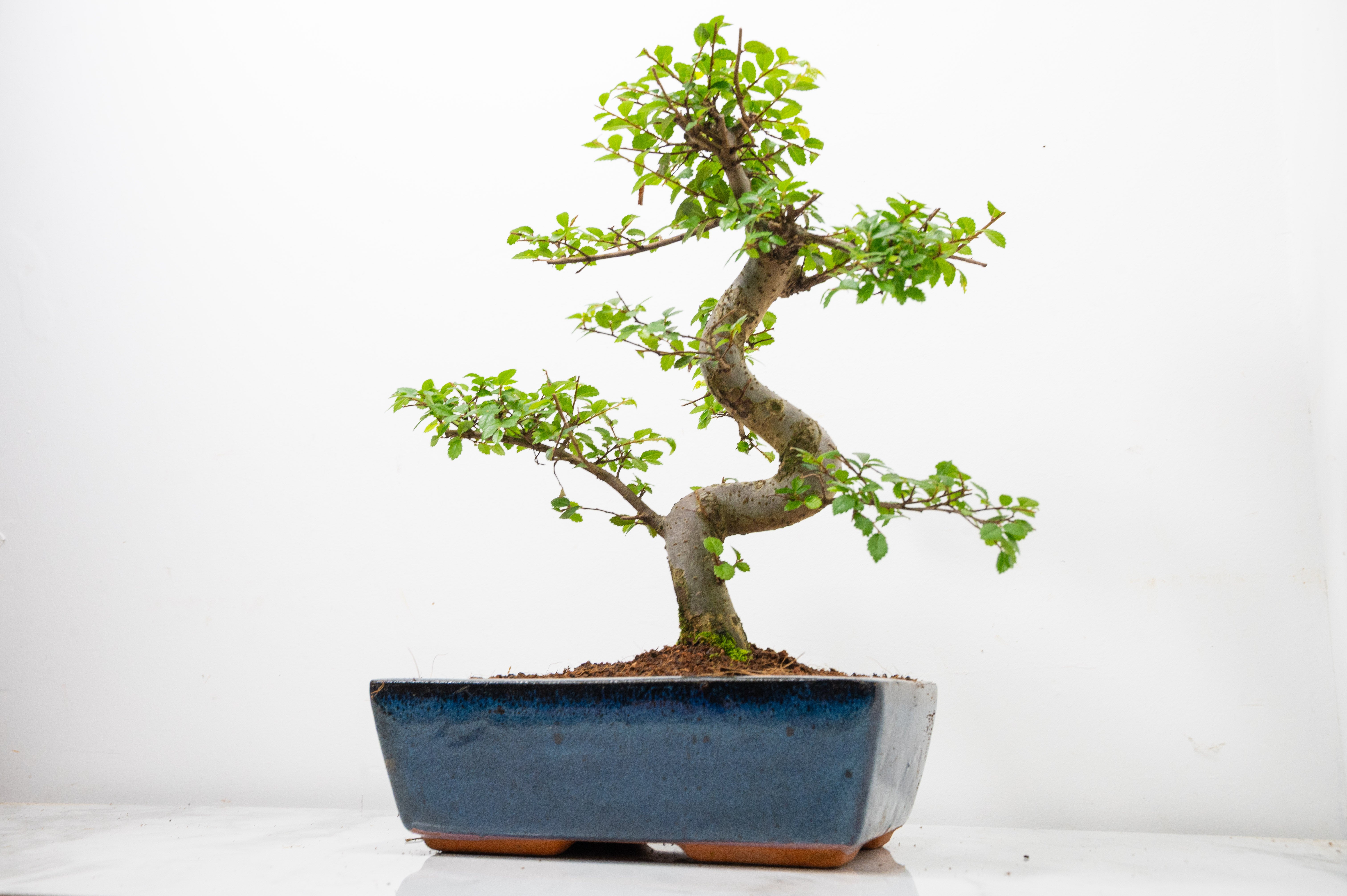 Chinese Elm - Zelkova bonsai tree, scissor/wire offer. Evergreen bonsai. Planted in a blue ceramic imported pot.
