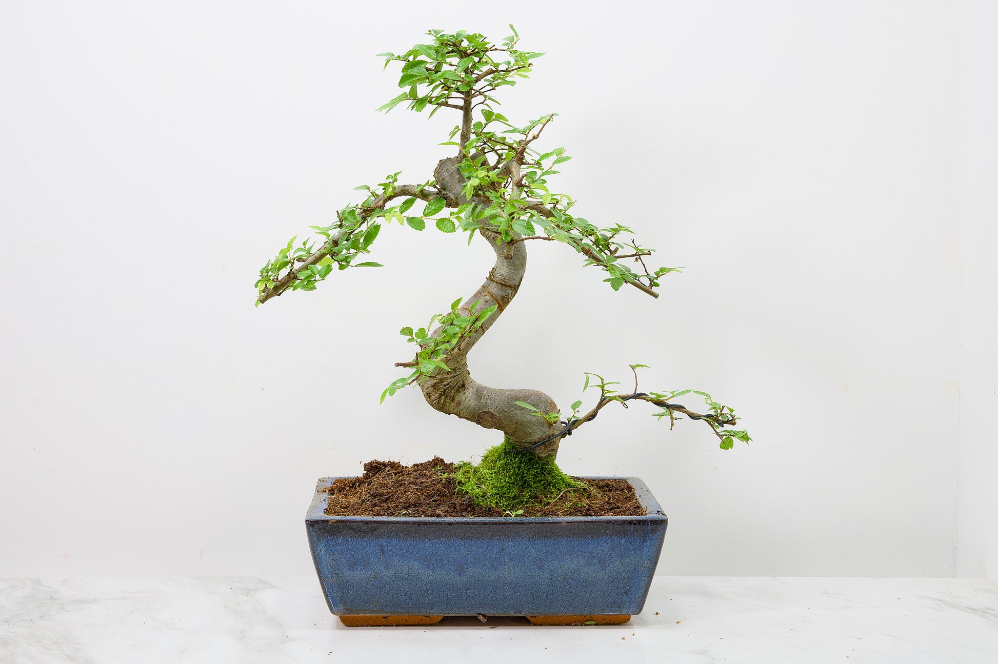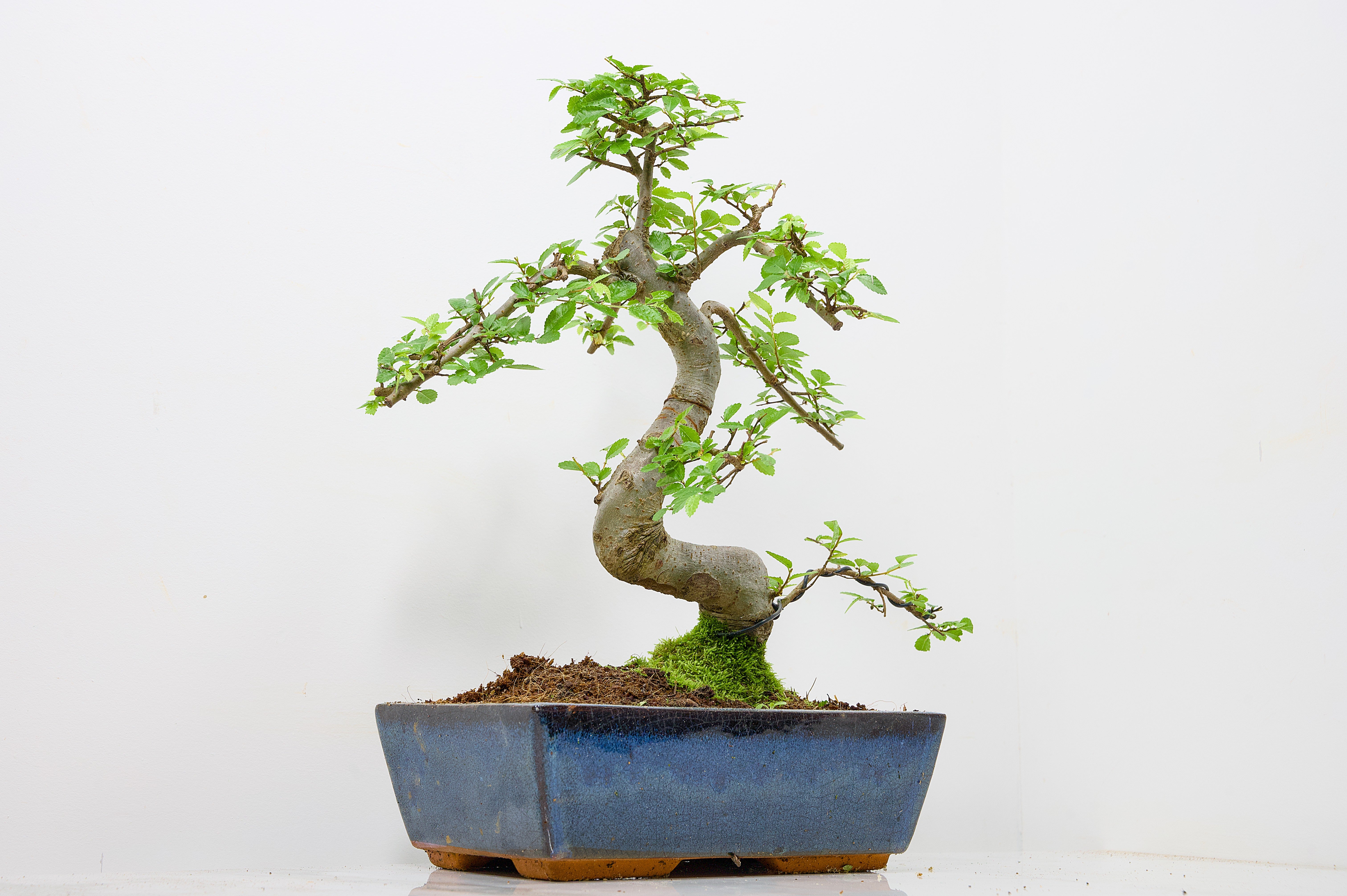 Chinese Elm - Zelkova bonsai tree, scissor/wire offer. Semi evergreen bonsai. Planted in a blue ceramic imported pot.