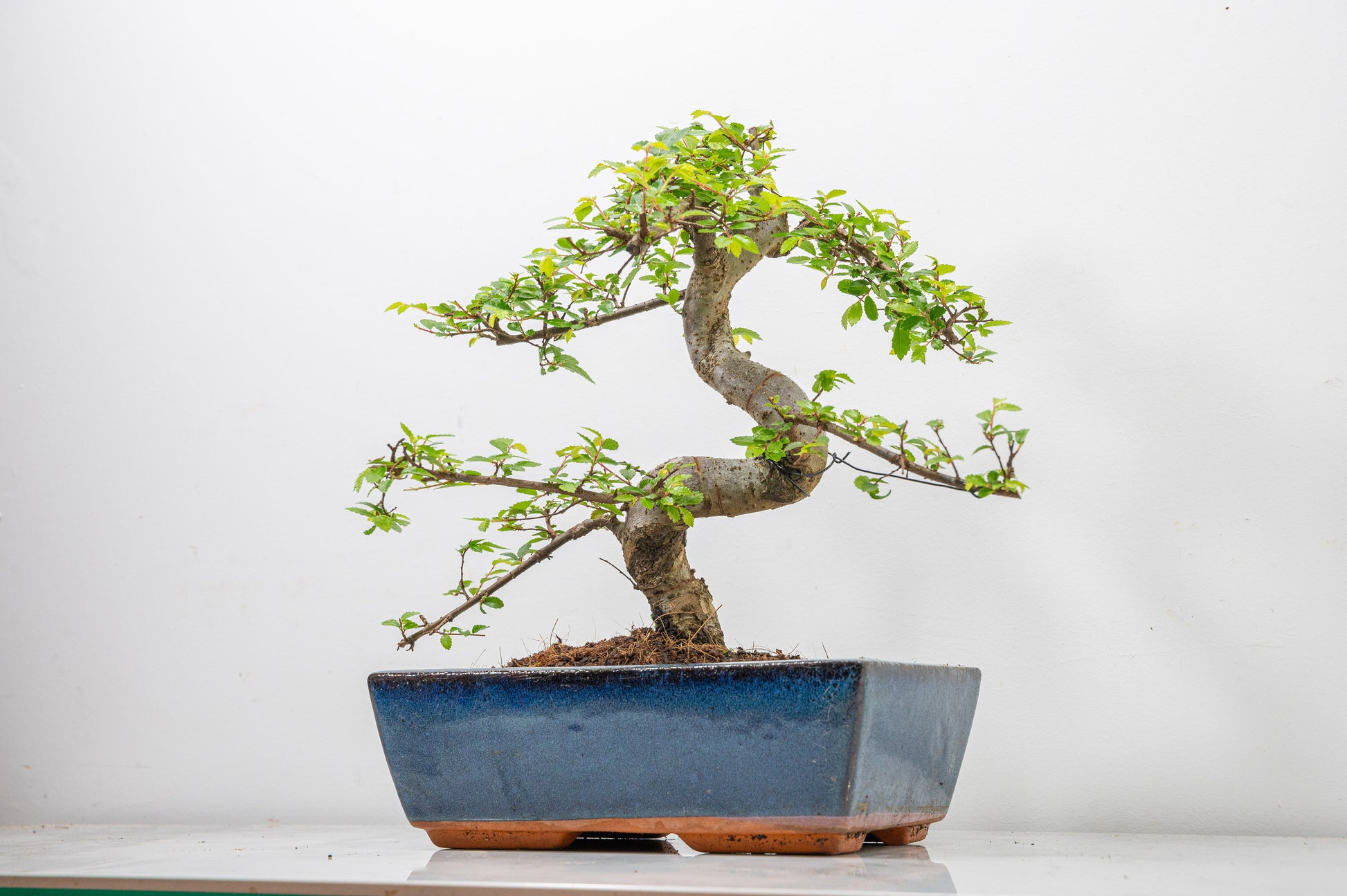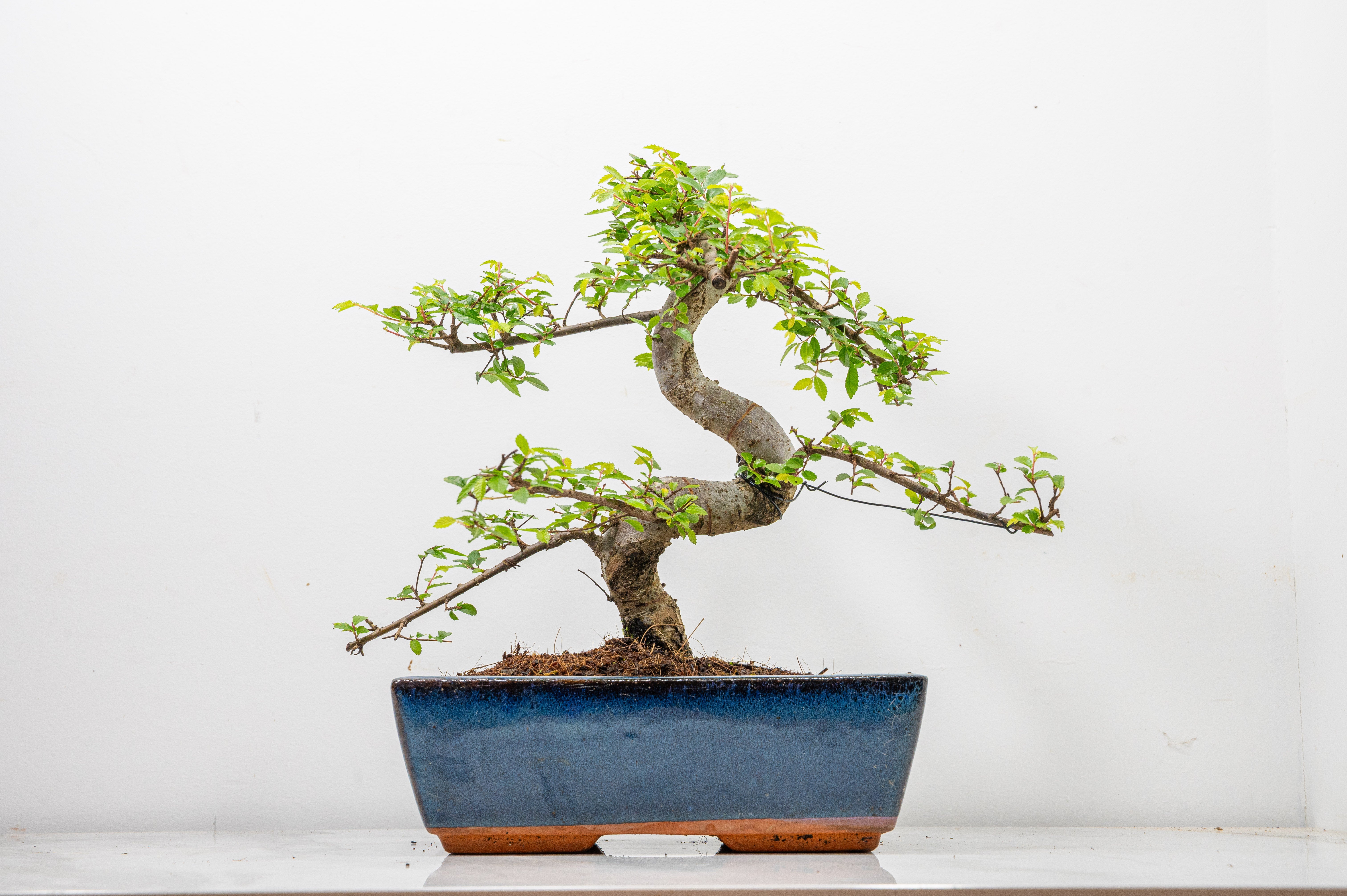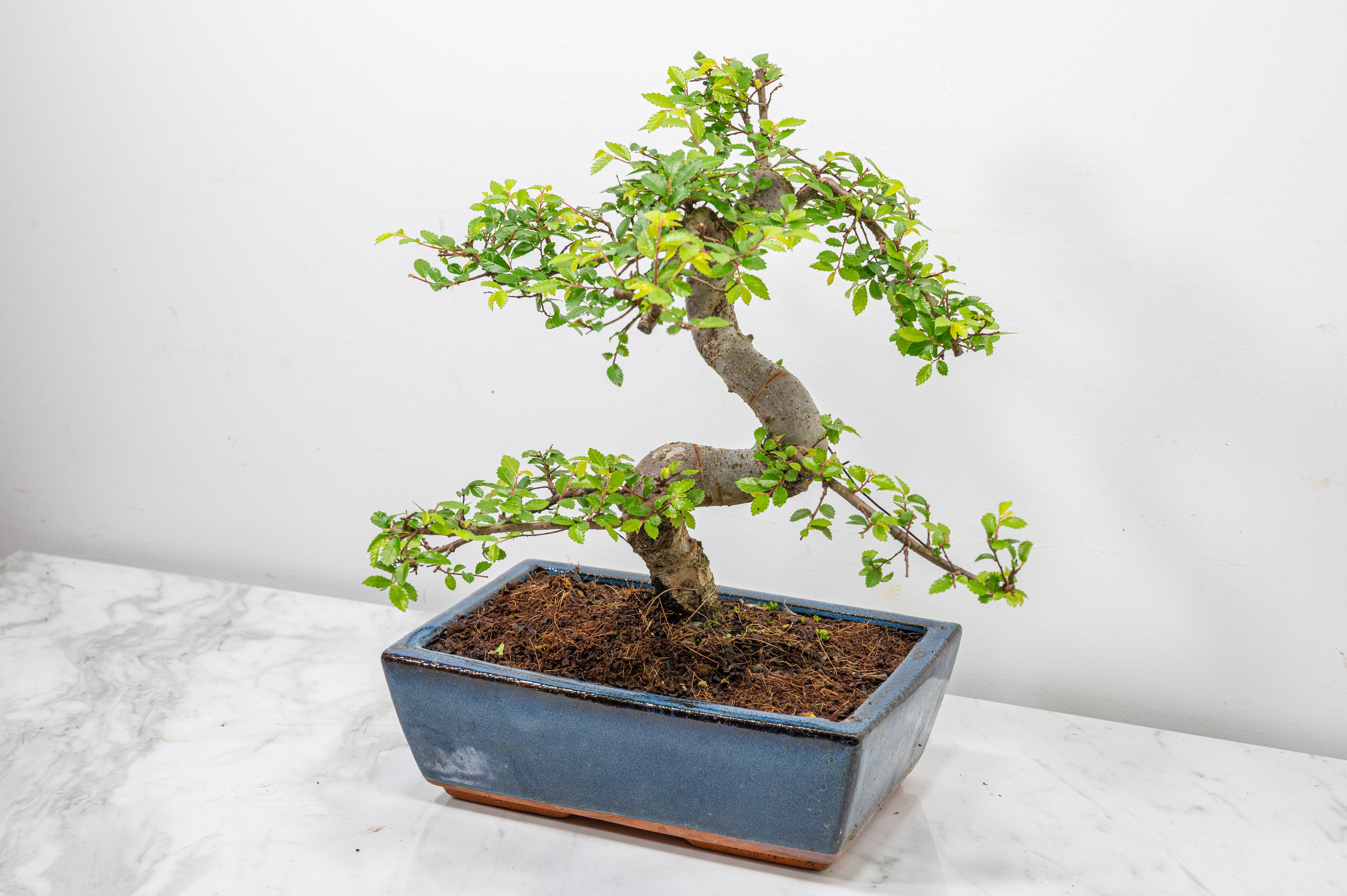 Chinese Elm - Zelkova bonsai tree, scissor/wire offer. Semi evergreen bonsai. Planted in a blue ceramic imported pot.