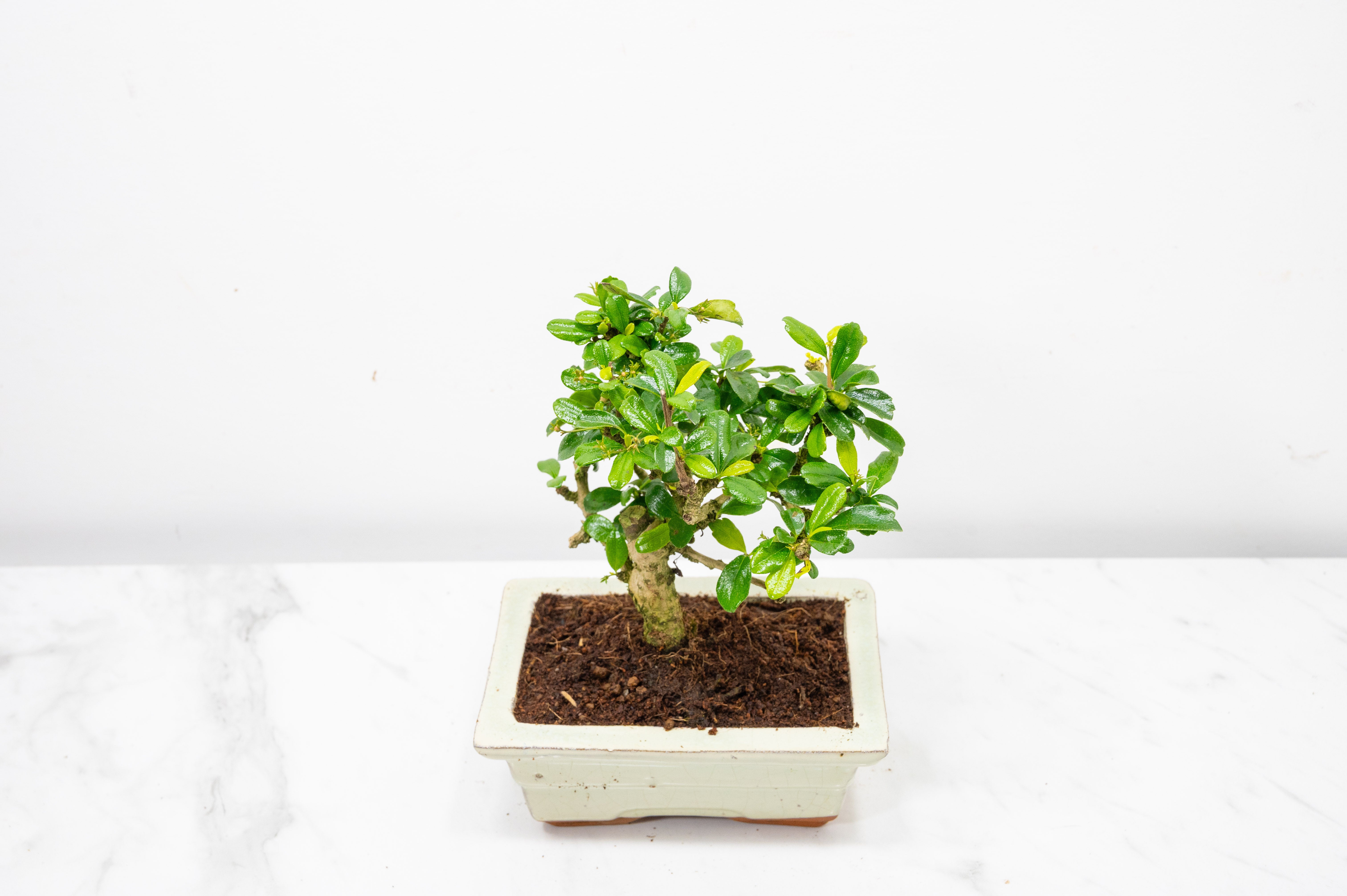 Fukien Tea Tree (Carmona retusa) bonsai thrives in warm, tropical conditions, making it an excellent indoor bonsai. It requires bright, consistent light, ideally from a south or west-facing window, and must be protected from temperatures below 15∘C. Watering is critical: keep the soil consistently moist but never soggy, watering thoroughly when the top layer feels slightly dry, and increasing humidity with a humidity tray or regular misting is highly beneficial. Fertilise with a balanced bonsai food every 2-4 weeks during the active growing season to support its health, its glossy green leaves, and its delicate white flowers.